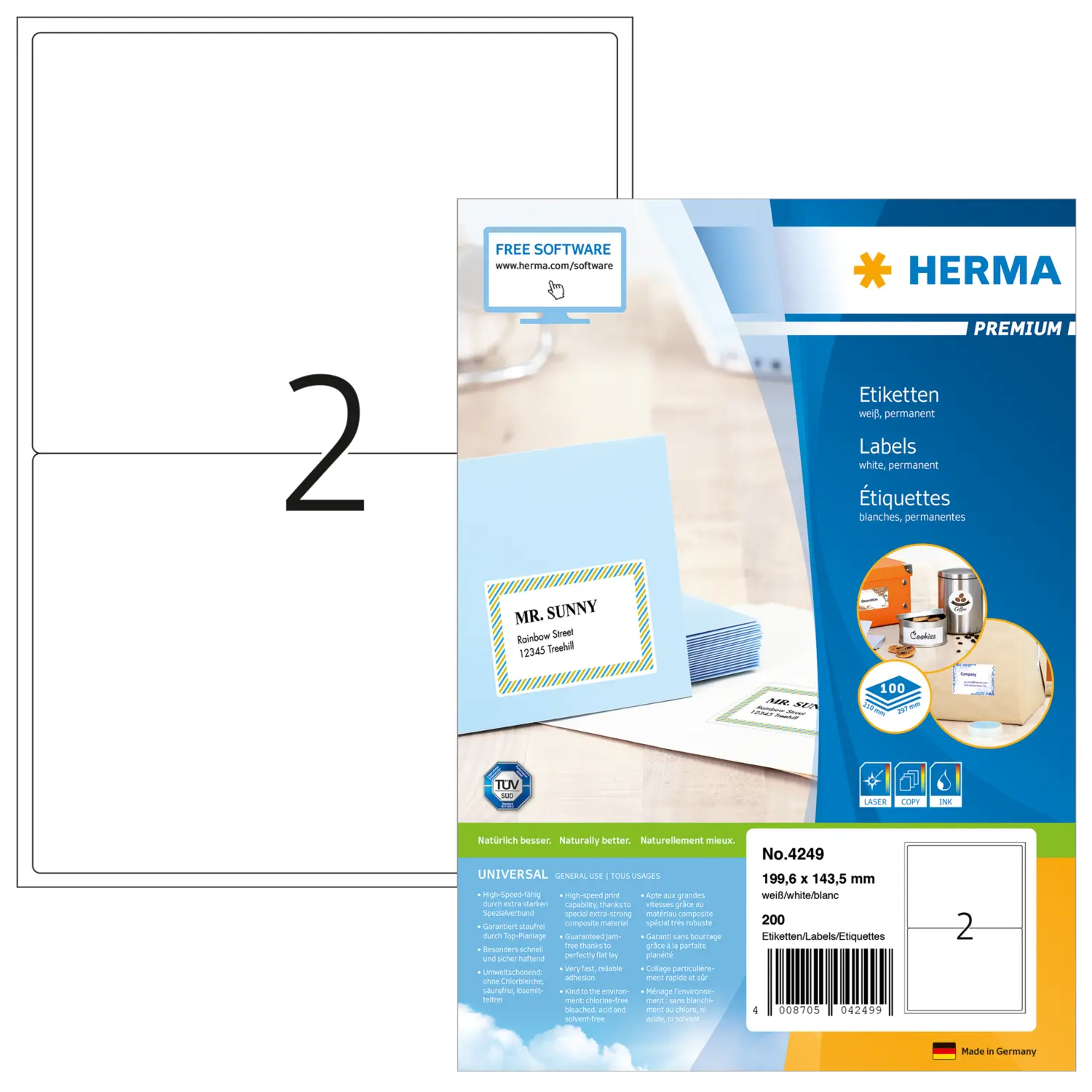Zelfklevende etiketten op A4-vellen, permanent hechtend. Perfect voor alle laser- en inkjetprinters, kopieerapparaten, kleurenlaserprinters en kleurenkopieerapparaten. Gegarandeerd storingvrije loop en geschikt voor high-speed dankzij extra sterke speciale materiaalsamenstelling, top-vlakligging en een veiligheidsrand rondom. Probleemloze doorvoer door de printer voor laserprinters en inkjetprinters getest en bevestigd door de TÜV SÜD. Hoge witheidsgraad en gelijkmatig oppervlak voor de beste afdrukresultaten in zwart/wit en kleur. Voelbaar dikker: extra dikke etiketten, eenvoudig opplakken. Zeer snel en goed hechtend, ook op koude en vochtige oppervlakken. Milieuvriendelijk en duurzaam: chloorvrij gebleekt, FSC® Mix Credit-gecertificeerd, oplosmiddelvrije contactlijm. Etikettenmateriaal recyclebaar via het oud papier, gooi rugpapier bij het restafval weg, verpakking van gerecycled karton. Gratis softwareoplossingen: www.herma.com/software.