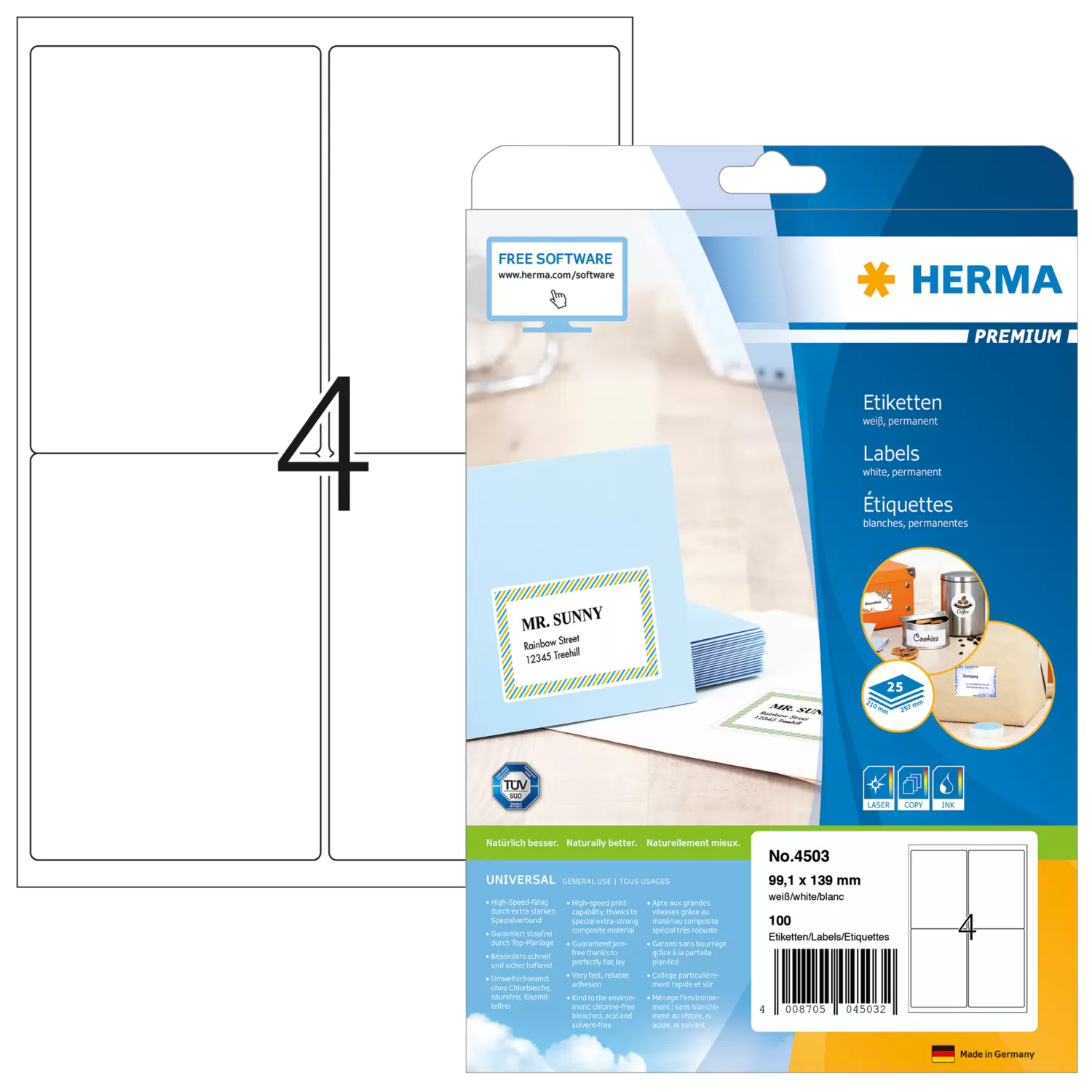 PREMIUM adresetiketten, A4, 99,1 x 139 mm, wit, permanent hechtend