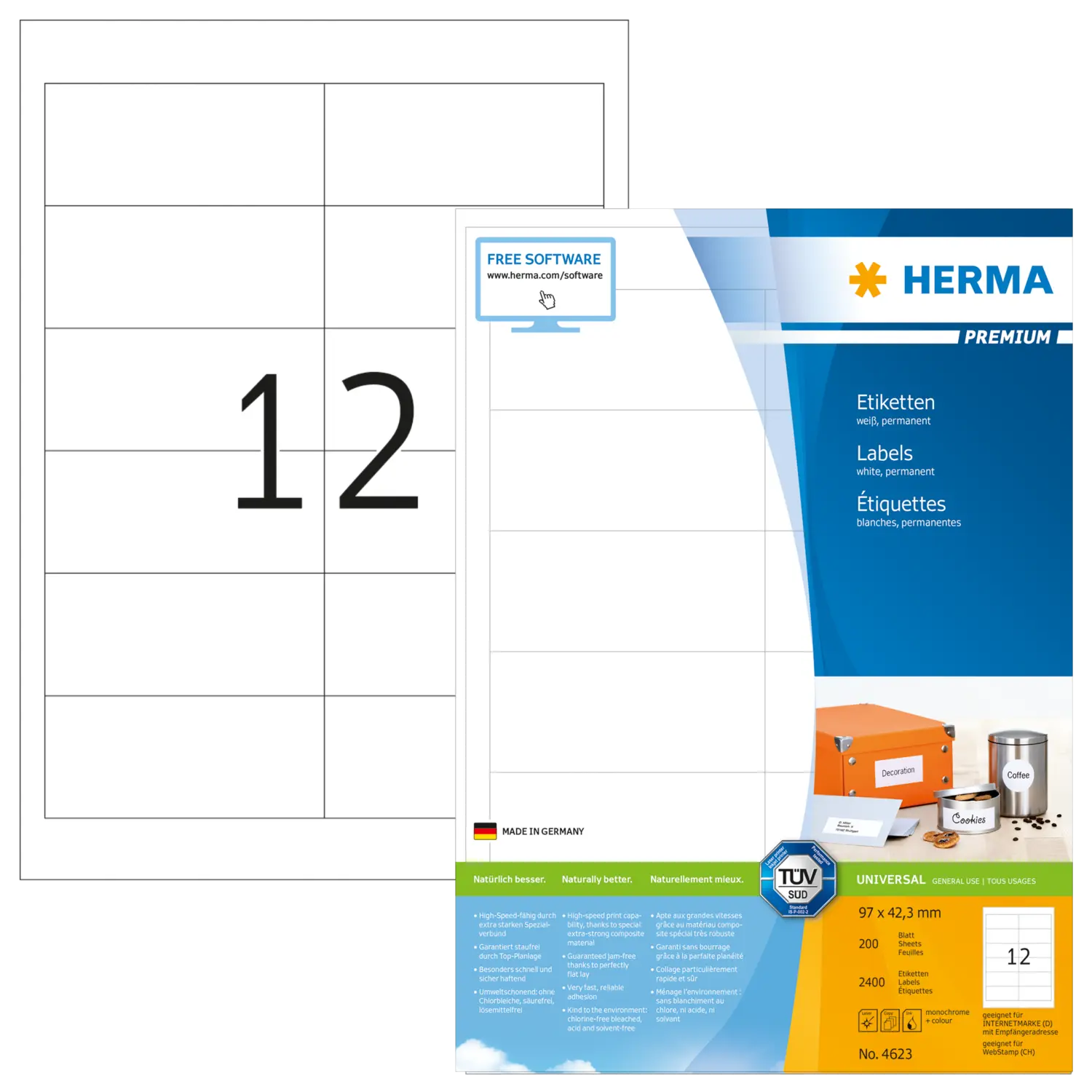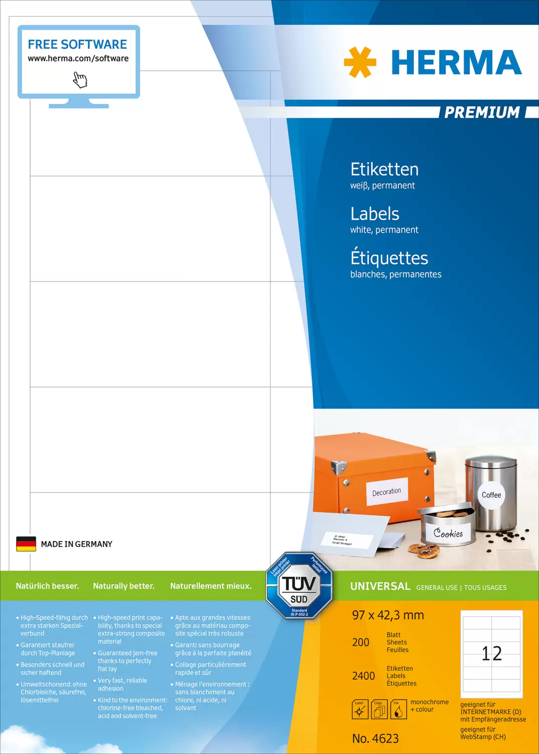 PREMIUM etiketten, A4, 97 x 42,3 mm, wit, permanent hechtend