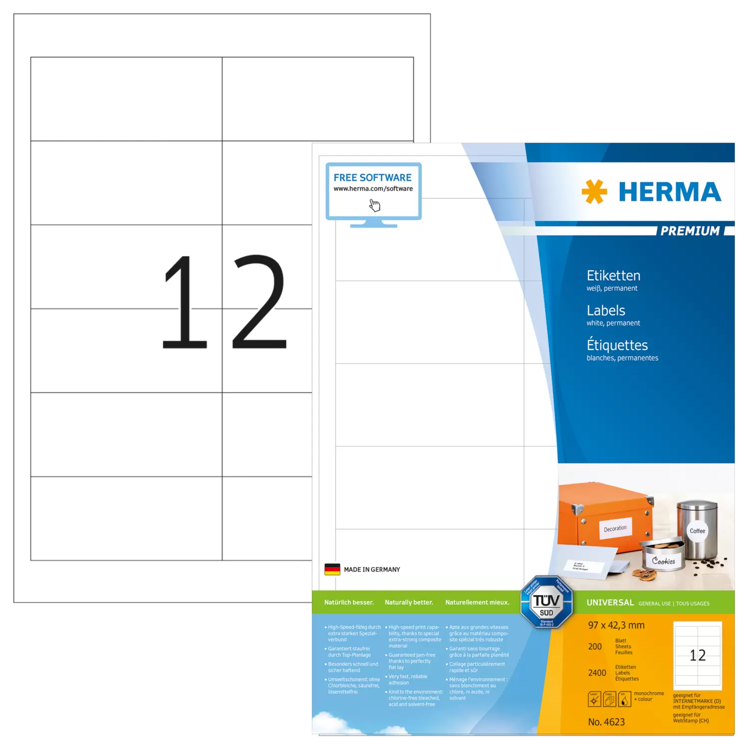 Zelfklevende etiketten op A4-vellen, permanent hechtend. Perfect voor alle laser- en inkjetprinters, kopieerapparaten, kleurenlaserprinters en kleurenkopieerapparaten. Gegarandeerd storingvrije loop en geschikt voor high-speed dankzij extra sterke speciale materiaalsamenstelling, top-vlakligging en een veiligheidsrand rondom. Probleemloze doorvoer door de printer voor laserprinters en inkjetprinters getest en bevestigd door de TÜV SÜD. Hoge witheidsgraad en gelijkmatig oppervlak voor de beste afdrukresultaten in zwart/wit en kleur. Voelbaar dikker: extra dikke etiketten, eenvoudig opplakken. Zeer snel en goed hechtend, ook op koude en vochtige oppervlakken. Milieuvriendelijk en duurzaam: chloorvrij gebleekt, FSC® Mix Credit-gecertificeerd, oplosmiddelvrije contactlijm. Etikettenmateriaal recyclebaar via het oud papier, gooi rugpapier bij het restafval weg, verpakking van gerecycled karton. Gratis softwareoplossingen: www.herma.com/software.