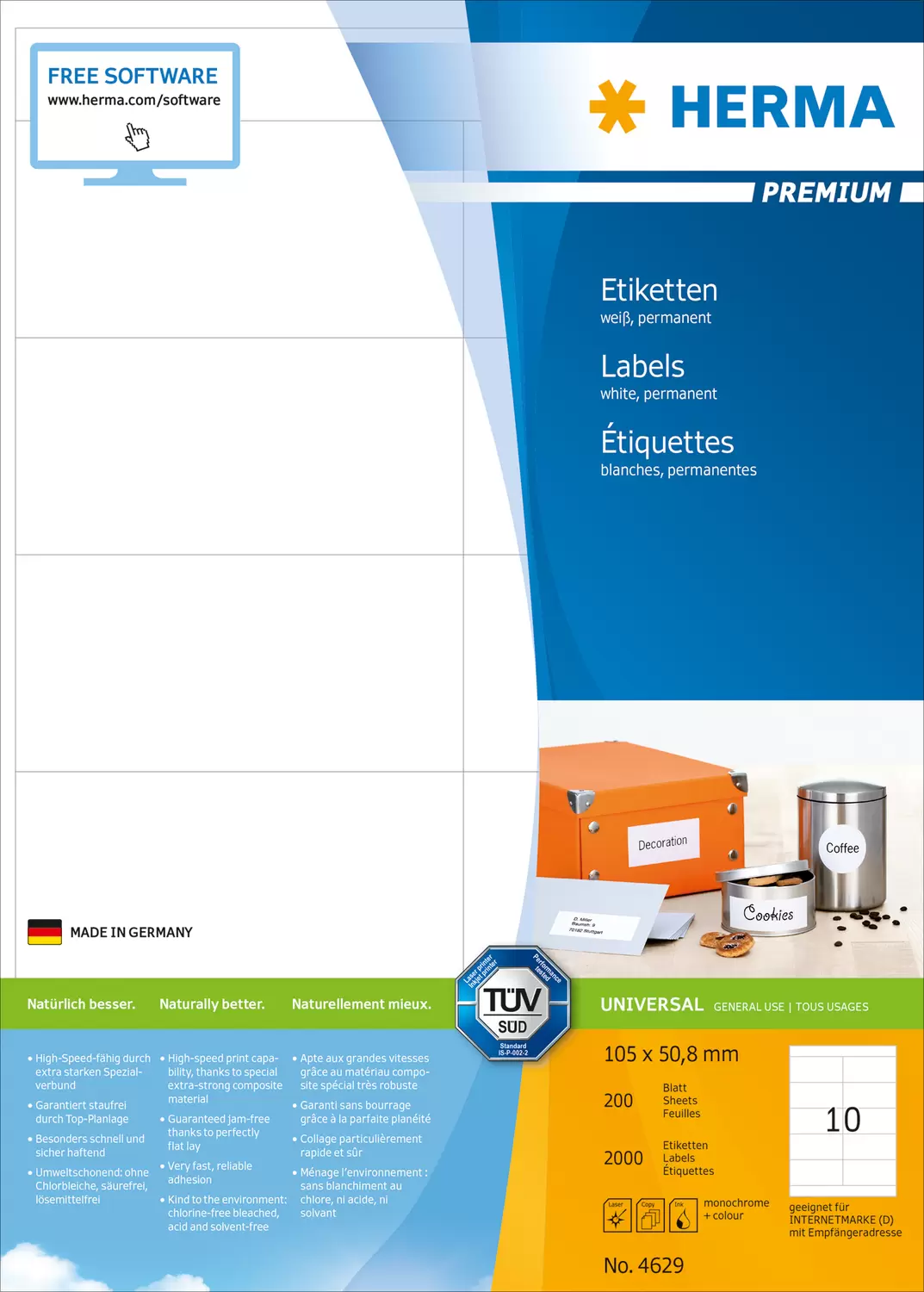 Zelfklevende etiketten op A4-vellen, permanent hechtend. Perfect voor alle laser- en inkjetprinters, kopieerapparaten, kleurenlaserprinters en kleurenkopieerapparaten. Gegarandeerd storingvrije loop en geschikt voor high-speed dankzij extra sterke speciale materiaalsamenstelling, top-vlakligging en een veiligheidsrand rondom. Probleemloze doorvoer door de printer voor laserprinters en inkjetprinters getest en bevestigd door de TÜV SÜD. Hoge witheidsgraad en gelijkmatig oppervlak voor de beste afdrukresultaten in zwart/wit en kleur. Voelbaar dikker: extra dikke etiketten, eenvoudig opplakken. Zeer snel en goed hechtend, ook op koude en vochtige oppervlakken. Milieuvriendelijk en duurzaam: chloorvrij gebleekt, FSC® Mix Credit-gecertificeerd, oplosmiddelvrije contactlijm. Etikettenmateriaal recyclebaar via het oud papier, gooi rugpapier bij het restafval weg, verpakking van gerecycled karton. Gratis softwareoplossingen: www.herma.com/software.