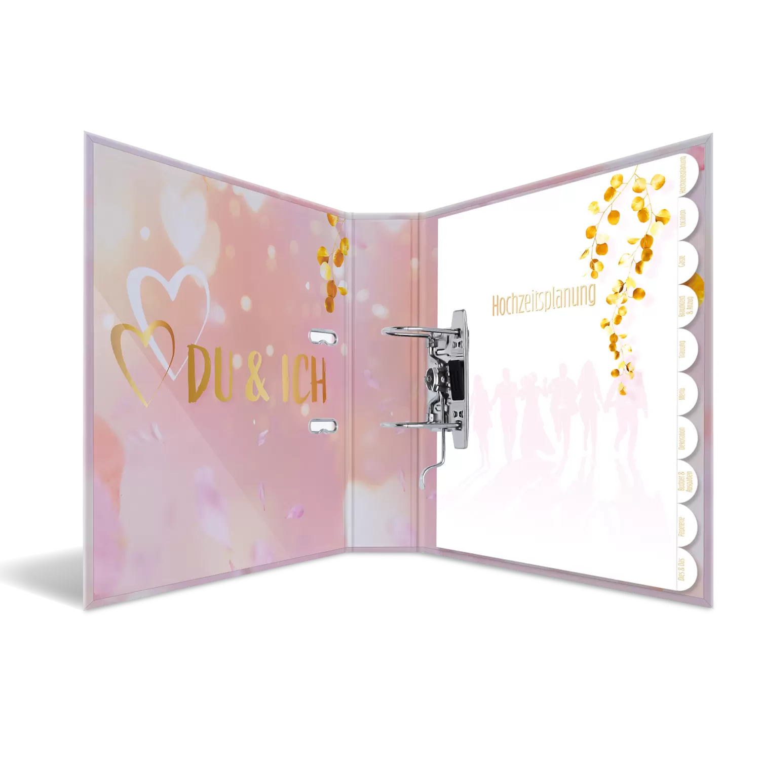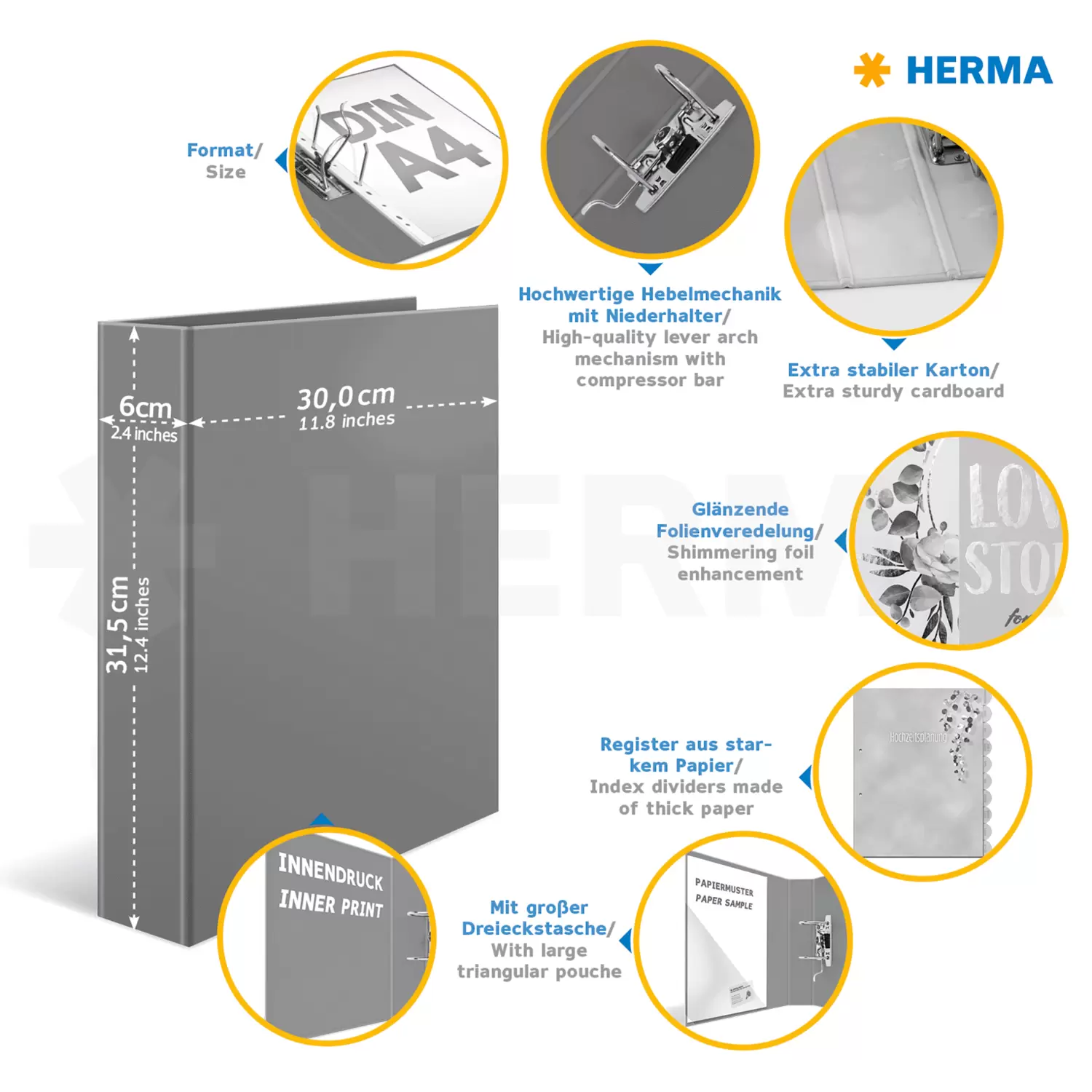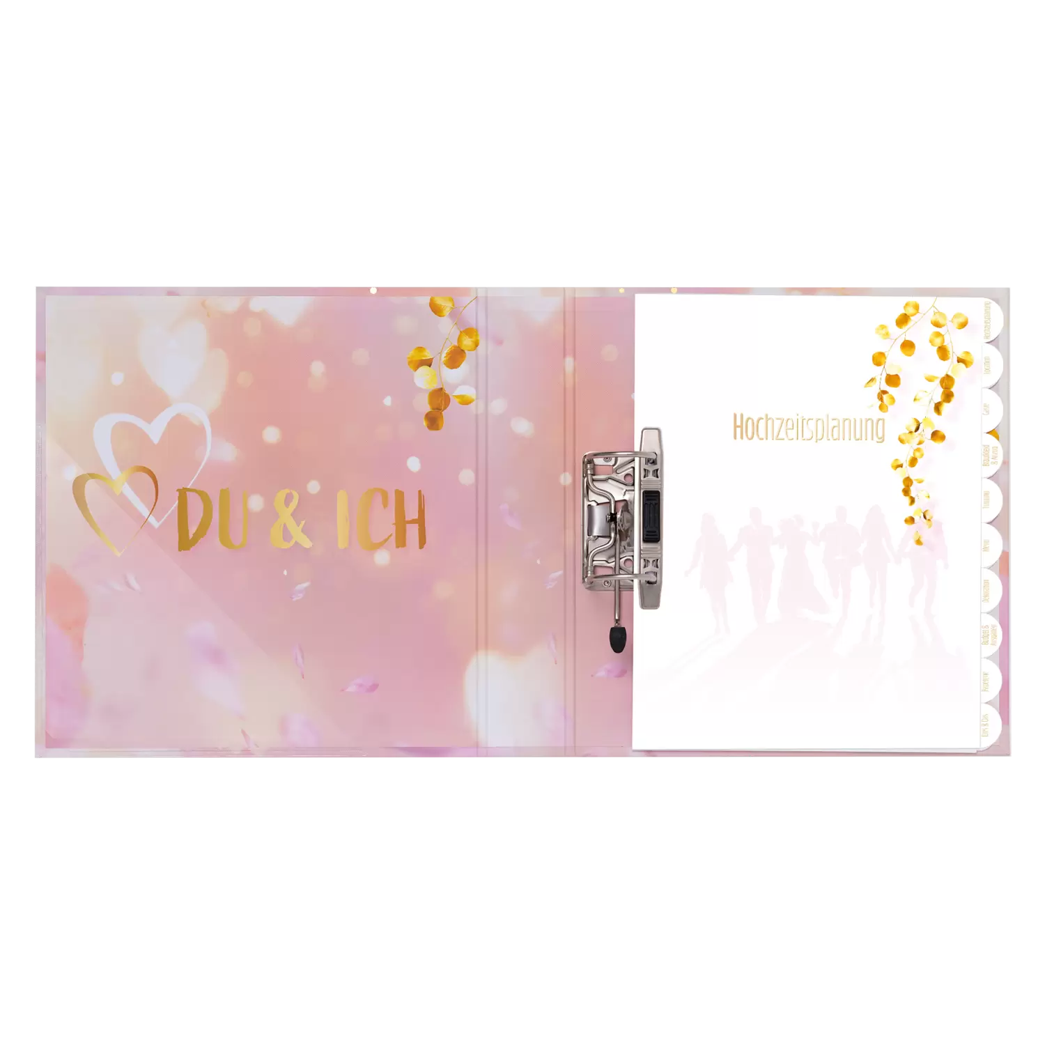 Weldra luiden de huwelijksklokken, de mooiste dag in het leven van twee geliefden komt dichter- en dichterbij. Maar voordat de droom van een perfecte bruiloft in vervulling kan gaan, moet u in de eraan vooraf gaande periode uw organisatietalent bewijzen. De bruiloftsplanner van HERMA helpt u daarbij. Er moet ongelooflijk veel worden gepland en georganiseerd: Waar vindt de huwelijksplechtigheid plaats? Wie wordt er uitgenodigd? Hoe gaat de tafeldecoratie eruit zien? Deze fraaie en modern gestylede ordner helpt u bij het archiveren van alle belangrijke documentatie voor de bruiloft en zorgt ervoor dat er geen papieren, lijsten of notities verloren gaan. In handzaam DIN A4-formaat kan hij gemakkelijk overal mee naartoe worden genomen, zodat u alle noodzakelijke stukken altijd bij de hand hebt. Het hoogwaardige hefboommechaniek en de metalen klem houden de inhoud van de ordner stevig bij elkaar, zodat deze niet smerig kan worden of eruit kan vallen. Het geïllustreerde en overzichtelijke register helpt u bij de planning en bevat alle punten die belangrijk zijn voor een bruiloft, zoals de organisatie van de tafeldecoratie, van de catering, de gastenlijst en nog veel meer. U hebt uw afspraken onmiddellijk, altijd en overal bij de hand. Met de 60 mm brede ordnerrug en het formaat 300 x 315 is er voor voldoende ruimte gezorgd.