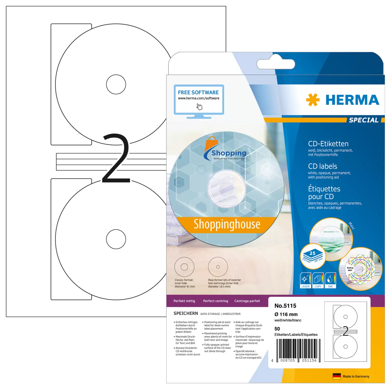 CD-etiketten, A4, Ø 116 mm, wit, ondoorzichtig, permanent hechtend