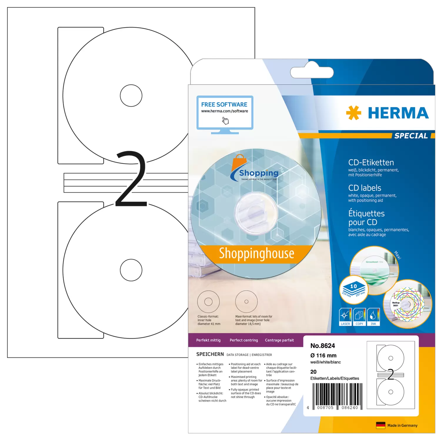 CD-etiketten, A4, Ø 116 mm, wit, ondoorzichtig, permanent hechtend