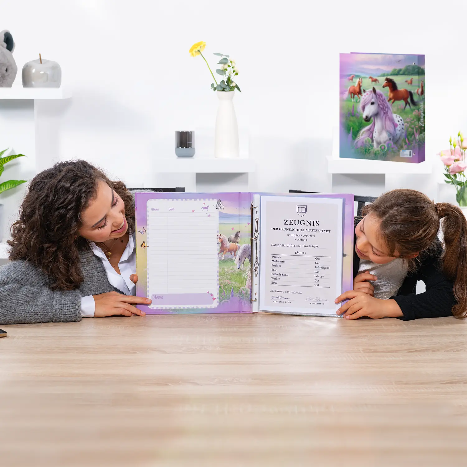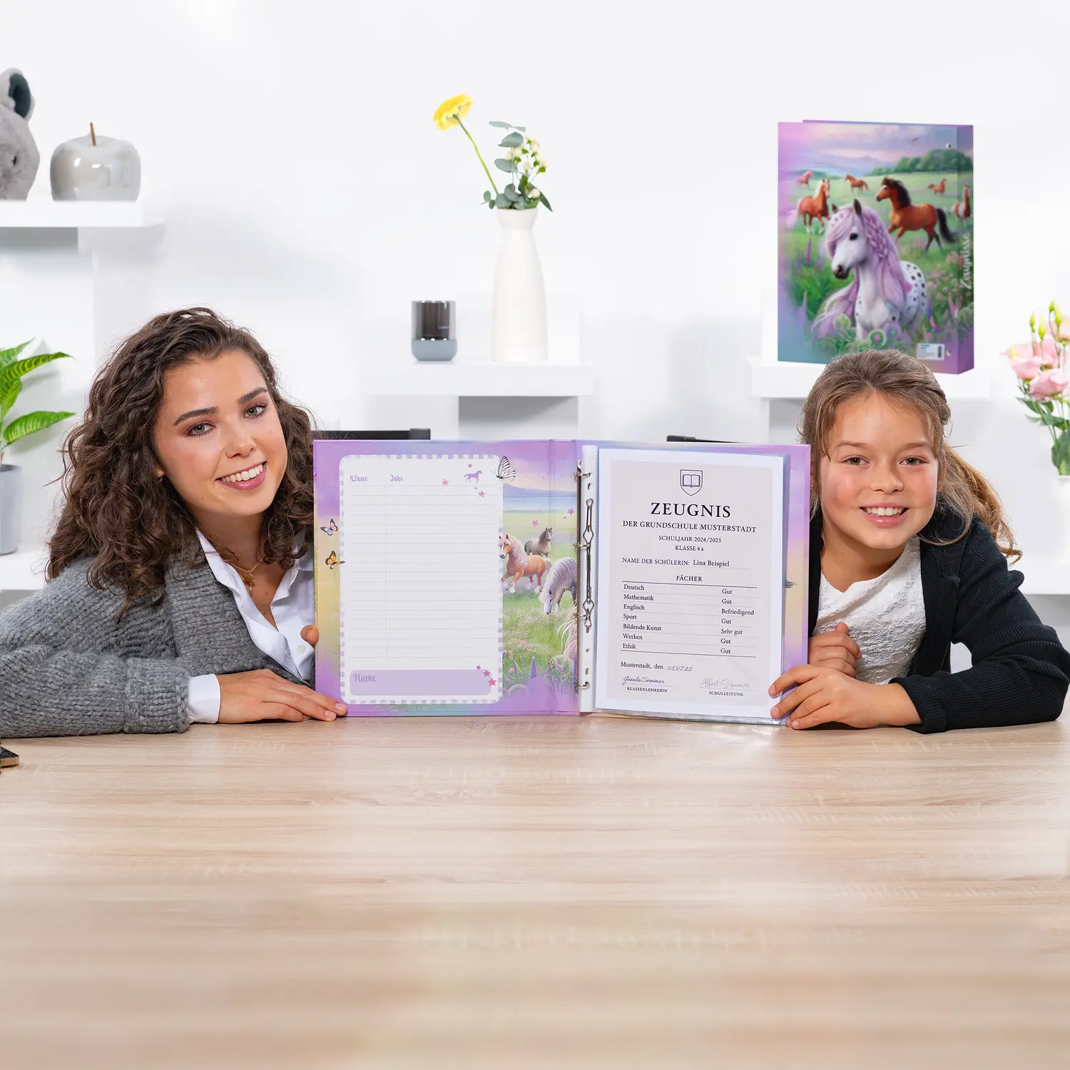 De HERMA Certificaatringband Paardenwereld in DIN A4 formaat valt op door de schattige paardenmotieven en het glanzende design. De stevige, volledig bedrukte kaft met bedrukking aan de binnenkant beschermt c ertificaten, diploma's, rapporten en belangrijke documenten op betrouwbare wijze. Dankzij het 4 ringsmechanisme en de klem kunnen documenten gemakkelijk geordend, verwisseld en veilig opgeborgen worden. Inclusief 10 glasheldere insteekhoezen voor maximaal 20 documenten. Een praktische, zelf te beschrijven inhoudsopgave zorgt voor overzicht en structuur Perfect voor school, opleiding en paardenliefhebbers.