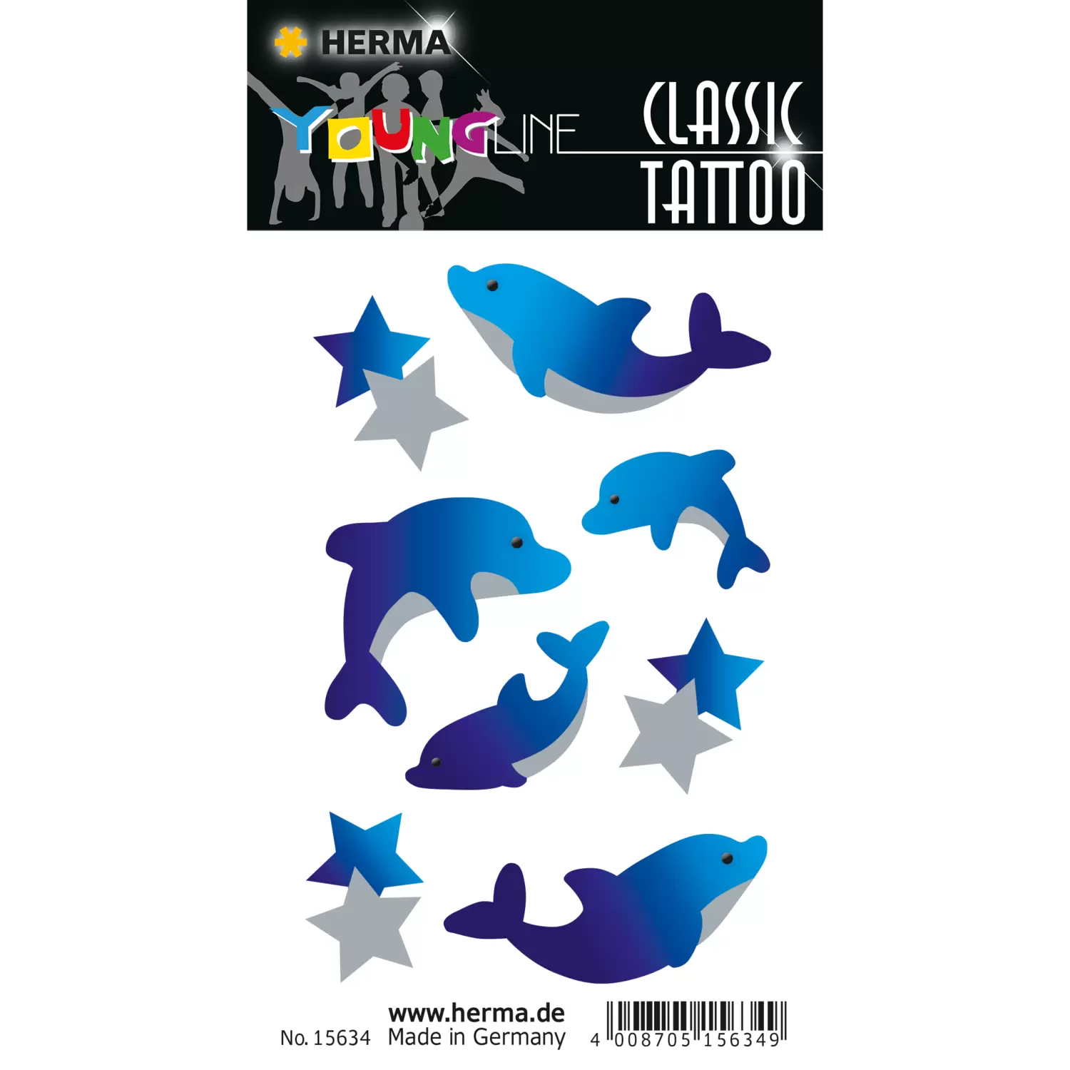 Tattoos hoeven niet voor eeuwig te zijn: met tattoostickers tover je prachtige plaatjes op je huid – maar dan tijdelijk. Huidvriendelijk, gemakkelijk aan te brengen en nog gemakkelijker weer te verwijderen: dat zijn de coole tattoostickers van HERMA. De gewenste tattoo uitknippen, de beschermende folie eraf trekken en op de gewenste plaats op de huid aanbrengen, met een vochtige doek 30 seconden stevig aandrukken en eraf trekken – klaar. De tattoos zijn watervast en blijven enkele dagen goed op de huid. Bovendien kunnen ze er heel gemakkelijk weer worden afgewassen: gewoon een beetje huid- of spijsolie op een doekje doen en de tattoo er zachtjes afvegen, deze wordt zonder resten achter te laten verwijderd. Een groot plezier voor groot en klein! De fraaie blauwe dolfijnen zijn dé hit als zomertattoo! Op naar het zwembad!