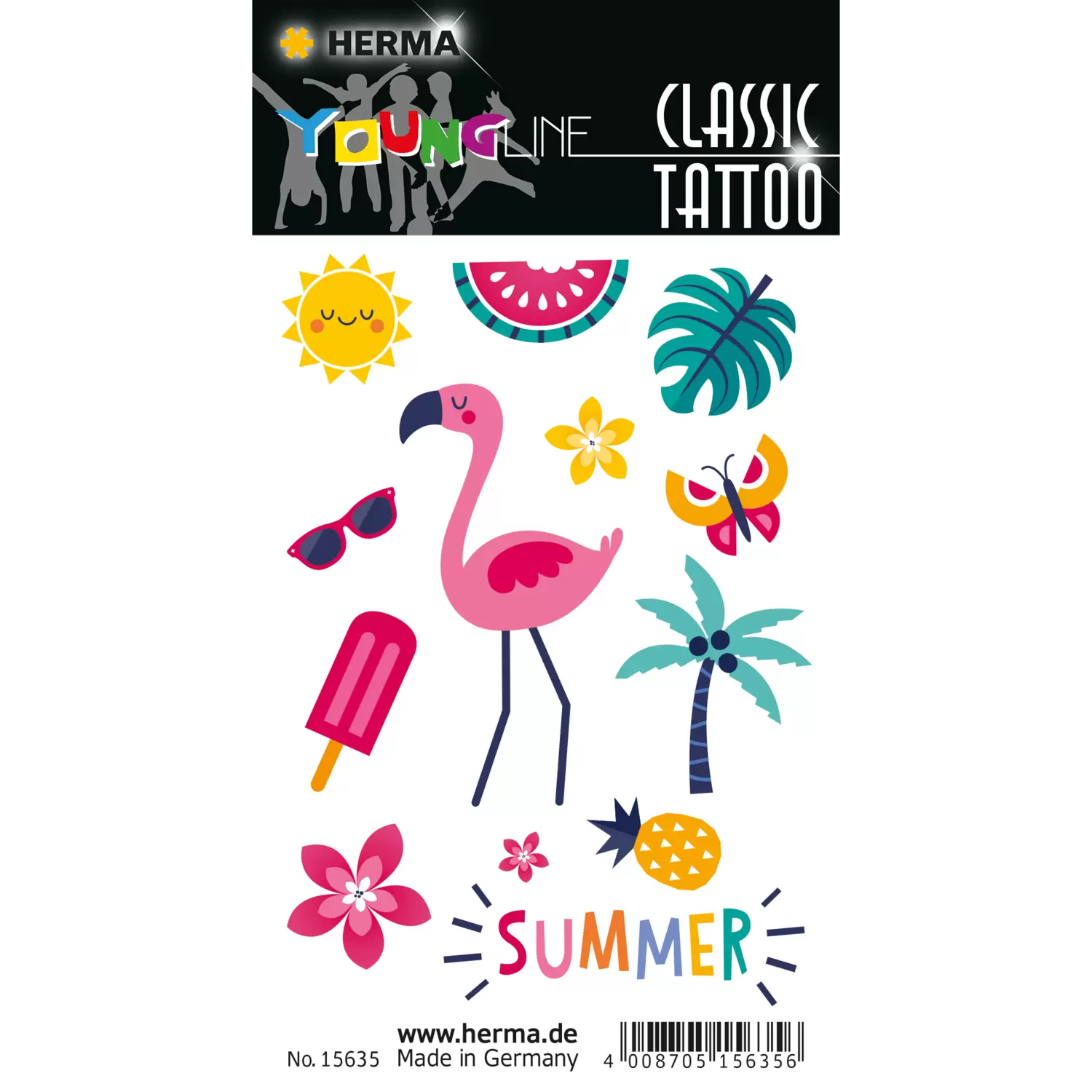 Tattoos hoeven niet voor eeuwig te zijn: met tattoostickers tover je prachtige plaatjes op je huid – maar dan tijdelijk. Huidvriendelijk, gemakkelijk aan te brengen en nog gemakkelijker weer te verwijderen: dat zijn de coole tattoostickers van HERMA. De gewenste tattoo uitknippen, de beschermende folie eraf trekken en op de gewenste plaats op de huid aanbrengen, met een vochtige doek 30 seconden stevig aandrukken en eraf trekken – klaar. De tattoos zijn watervast en blijven enkele dagen goed op de huid. Bovendien kunnen ze er heel gemakkelijk weer worden afgewassen: gewoon een beetje huid- of spijsolie op een doekje doen en de tattoo er zachtjes afvegen, deze wordt zonder resten achter te laten verwijderd. Een groot plezier voor groot en klein! Met de tattoostickers ‘summerfeeling’ haal je de zomer in huis en op je huid. De prachtig getekende tattoos in vrolijke zomerse kleuren zorgen voor plezier en goede zin. Let the sun shine!