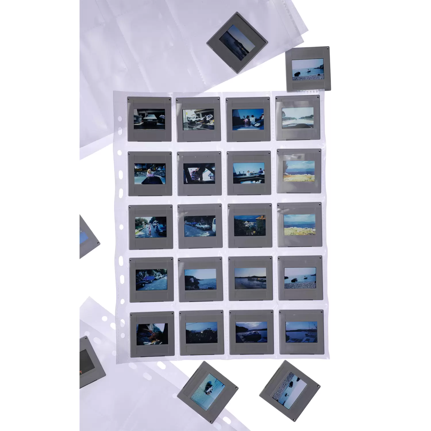 De HERMA diahoesjes zijn ideaal voor het netjes en overzichtelijk bewaren en archiveren van kleinbeeld-dia's. Ze zijn gemaakt van transparant, robuust en weekmakervrij heldermat polypropyleen en bieden per hoesje plek aan 20 ingeraamde dia's van het formaat 50 x 50 mm. Bijzonder eraan zijn de speciale beschermflapjes die voorkomen dat de dia's uit de hoesjes kunnen vallen. Zo kunnen de dia's er gemakkelijk worden ingestoken en uitgenomen en zijn desondanks optimaal beschermd. Een hoesje is ca. 24,4 x 30,1 cm groot en kan dankzij de europerforatie gemakkelijk in ordners, ringbanden of fotoboeken worden opgeborgen. Voor het optimaal vasthouden worden varianten met 4 ringen aanbevolen. Er zitten 100 vellen in een verpakking en dus is er genoeg plek voor max. 2000 dia's.
