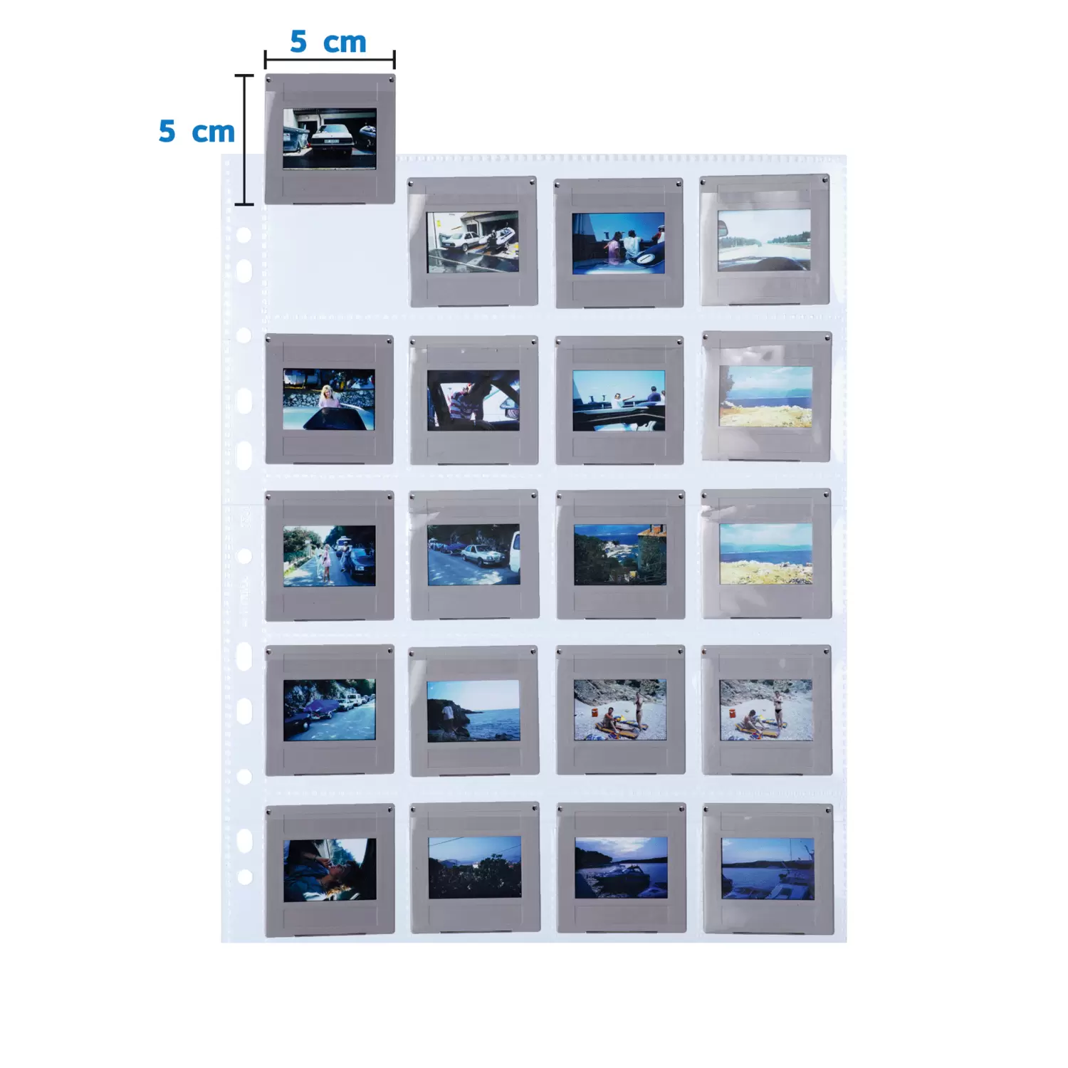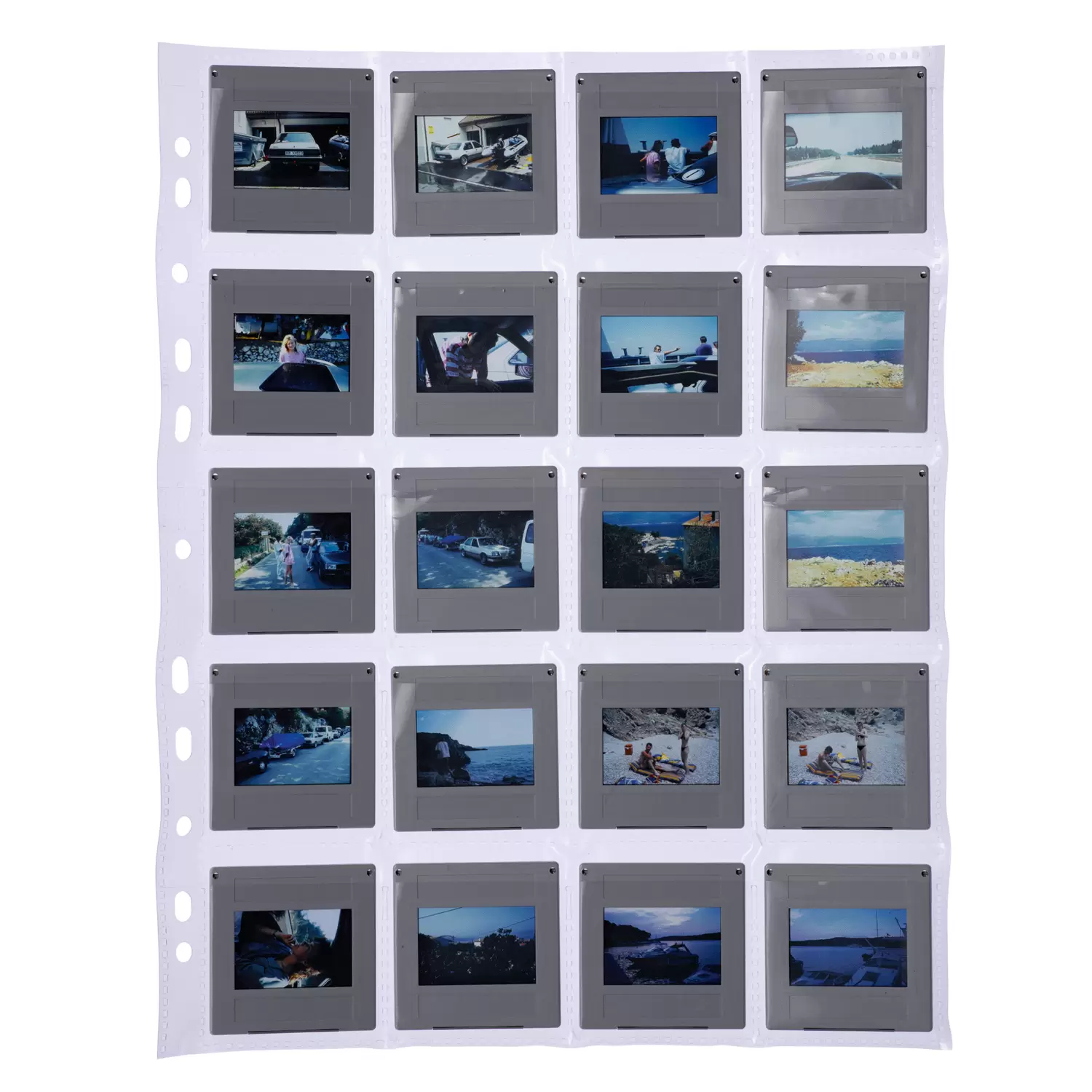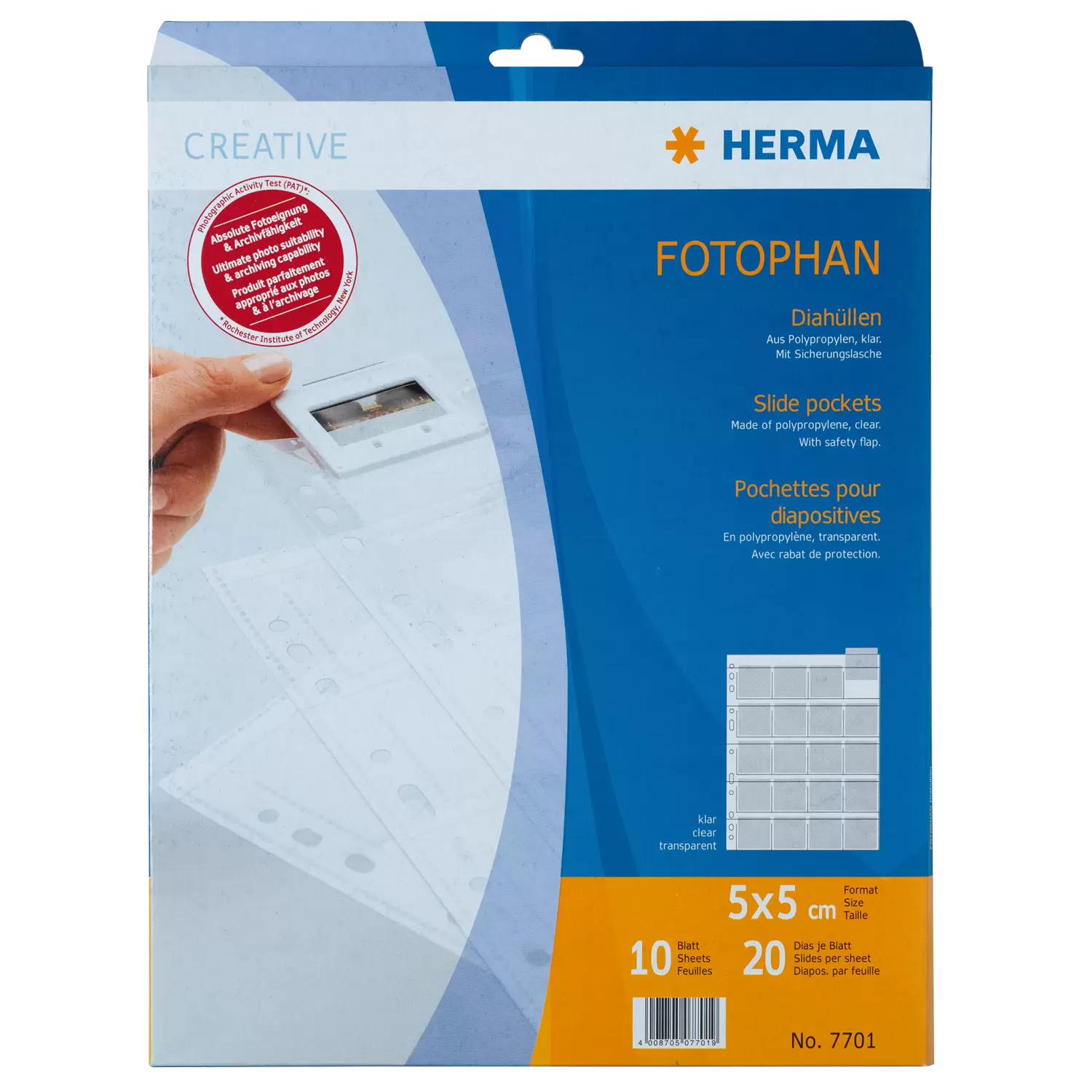 De HERMA diahoesjes zijn ideaal voor het netjes en overzichtelijk bewaren en archiveren van kleinbeeld-dia's. Ze zijn gemaakt van transparant, robuust en weekmakervrij helder polypropyleen en bieden per hoesje plek aan 20 ingeraamde dia's van het formaat 50 x 50 mm. Bijzonder eraan zijn de speciale beschermflapjes die voorkomen dat de dia's uit de hoesjes kunnen vallen. Zo kunnen de dia's er gemakkelijk worden ingestoken en uitgenomen en zijn desondanks optimaal beschermd. Een hoesje is ca. 24,4 x 30,1 cm groot en kan dankzij de europerforatie gemakkelijk in ordners, ringbanden of fotoboeken worden opgeborgen. Voor het optimaal vasthouden worden varianten met 4 ringen aanbevolen. Er zitten 10 vellen in een verpakking en dus is er voldoende plek voor max. 200 dia's.