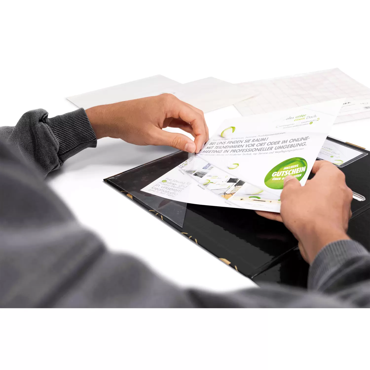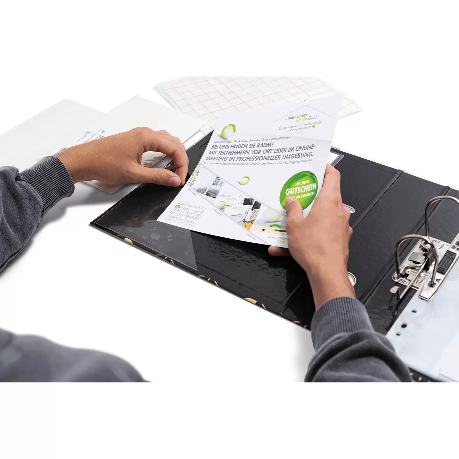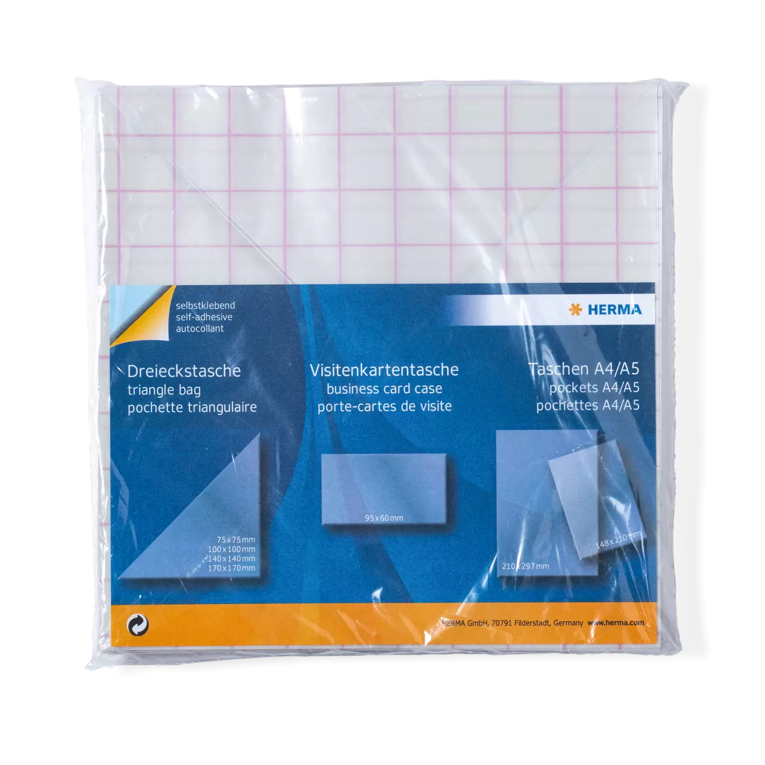 Het praktische extra vak om in albums, ordners en ringmappen, offerte- en presentatiemappen te plakken: de transparante, zelfklevende insteekhoeken van HERMA. De insteekdriehoeken, ook bekend als plakhoekjes of uitleenkaartvakjes, zijn gemaakt van glasheldere polypropyleenfolie, hebben een rugbreedte van 14 cm en zijn daarmee ideaal voor documenten als ansichtkaarten, flyers, brochures en overzichtsbladen. De insteekdriehoeken zijn gemakkelijk aan te brengen, zelfklevend en hechten goed op gladde oppervlakken. Zo zijn documenten die vaak worden gebruikt, zoals kalenders, roosters of to-do-lijstjes, maar ook visitekaartjes of brochures voor zakelijke afspraken, altijd onder handbereik. Gewoon het rugpapier verwijderen, de insteekdriehoek op de gewenste plaats plakken, de papieren erin steken en een nuttig gebruik maken van de tot dan toe ongebruikte plek. Clever en praktisch.