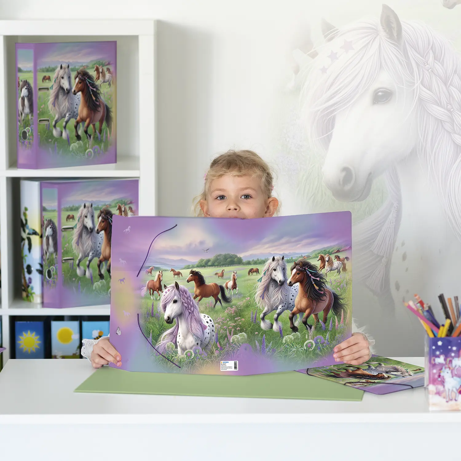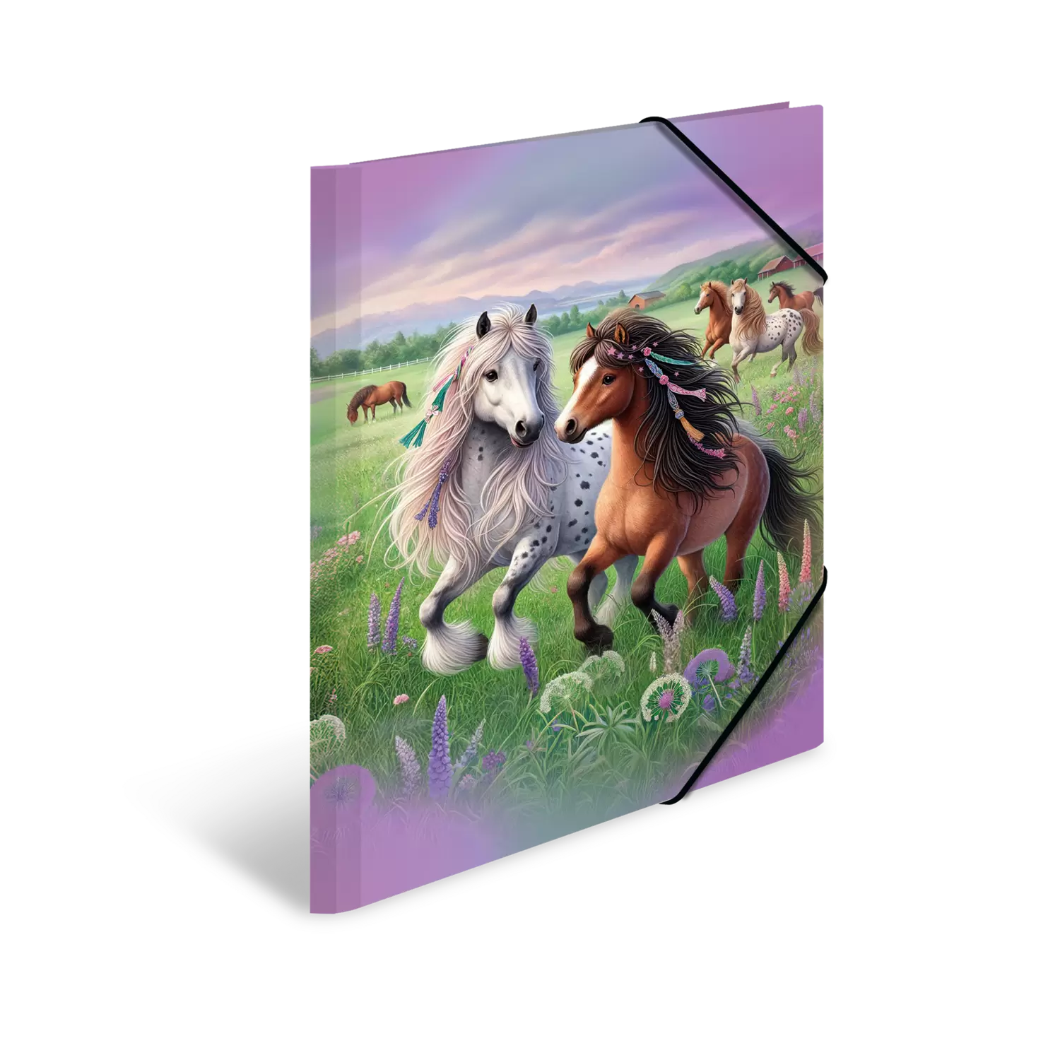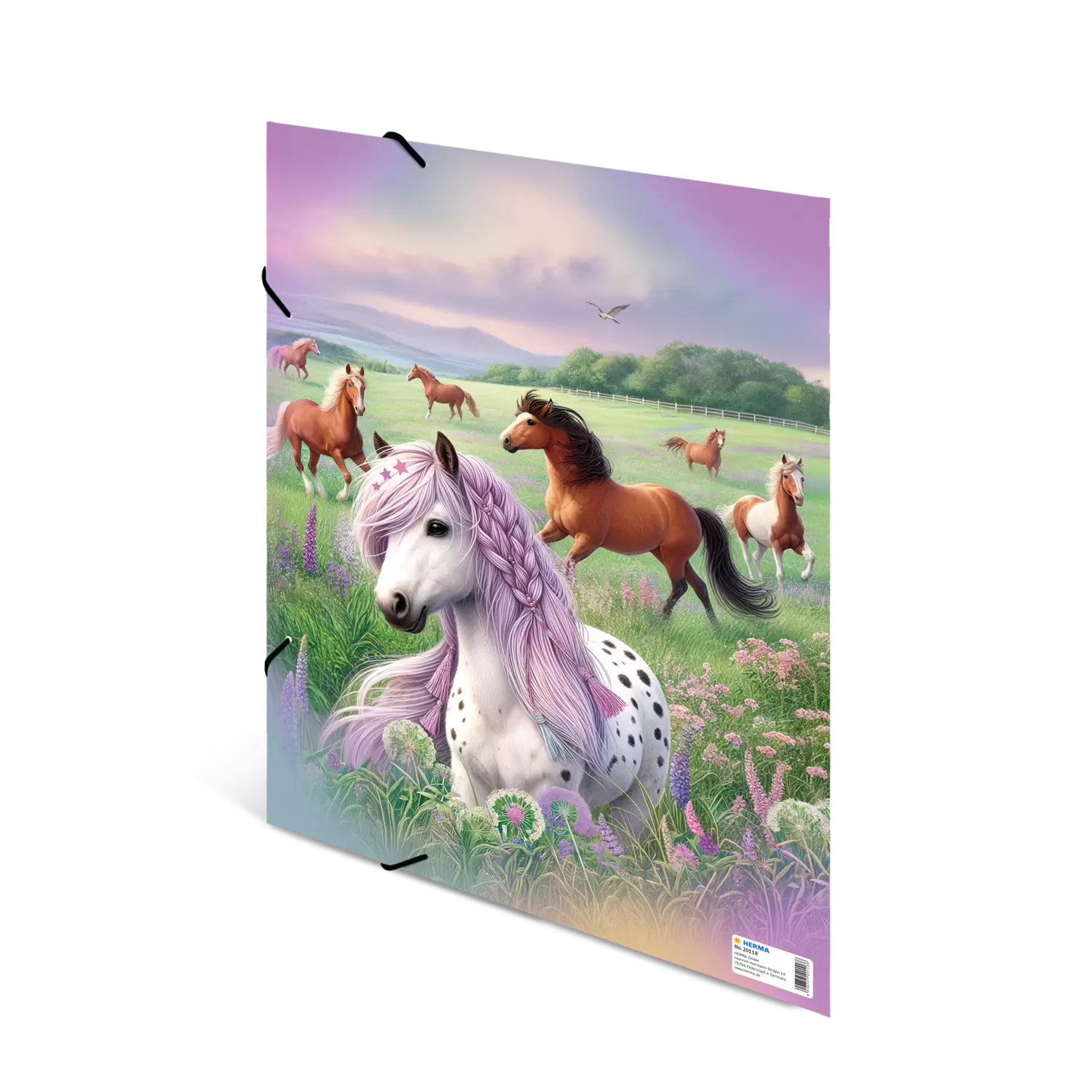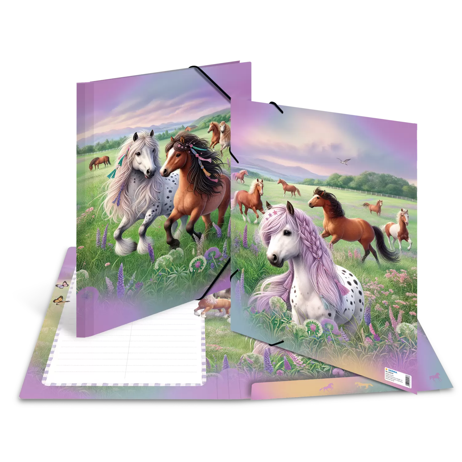 - Geschikt voor formaten tot DIN A3, van stevig karton, met elastieken hoekspanners en 3 binnenflappen met print
