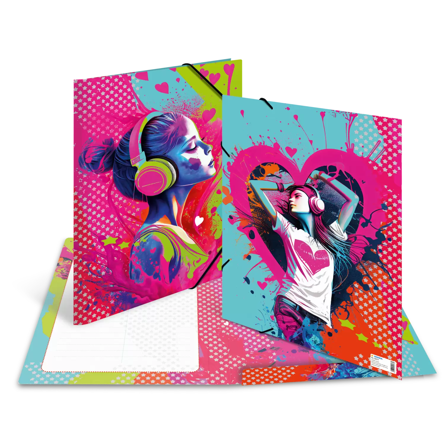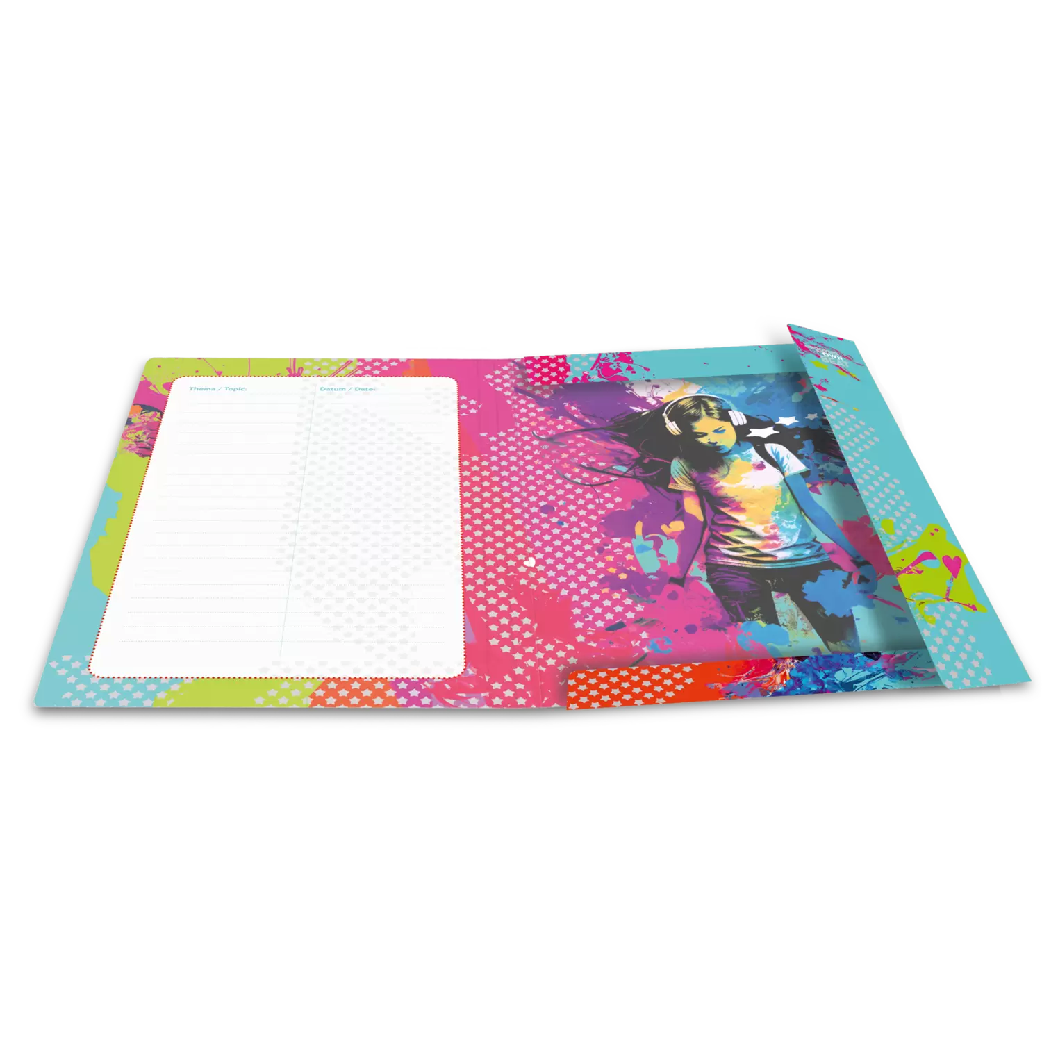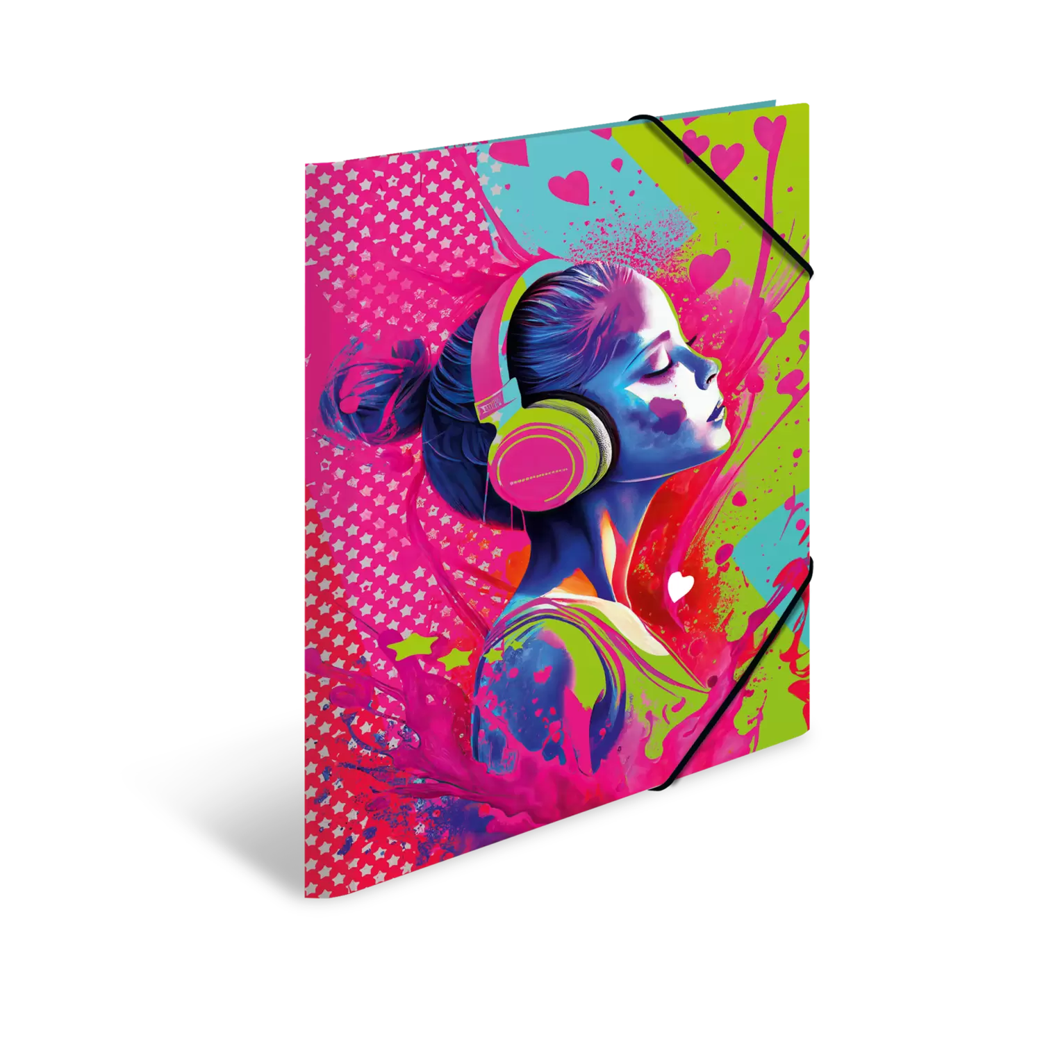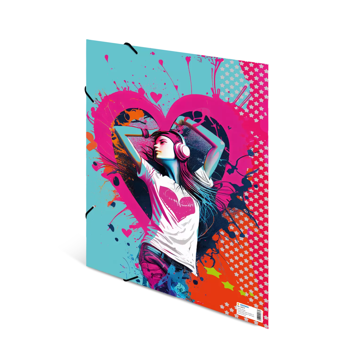 Muziek geeft meer kleur aan het leven! Met zijn felgekleurde en fluorescerende ontwerp "Music Girl" is deze verzamelmap een echte blikvanger die de boel onmiddellijk weet op te fleuren. Praktisch en robuust - dat is kwaliteit van HERMA. De map meet 44 cm x 33,5 cm en is dus groot genoeg voor papieren, tekeningen en documenten tot DIN A3-formaat. Hij is gemaakt van stevig karton en dankzij twee hoogwaardige hoekspanners gemakkelijk te openen en te sluiten. Dankzij de drie binnenflappen wordt de inhoud beschermd en ook kleiner papierwerk kan er niet uit vallen.