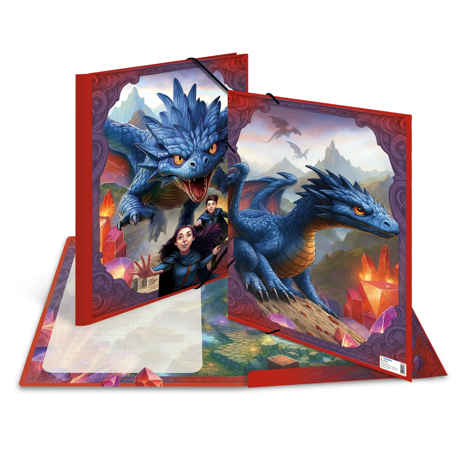 Het wordt spannend: de magische draken komen eraan! Het liefdevol geillustreerde ontwerp toont de fantastische wezens in actie: vuurspuwend, vliegend en onderweg met hun trouwe drakenrijders. Het perfecte motief voor fantasierijke drakenfans. Praktisch en robuust. Dat is kwaliteit van HERMA. De map meet 44 cm x 33,5 cm en is daarmee groot genoeg voor papieren, tekeningen en documenten tot een formaat van DIN A3. Hij is gemaakt van stevig karton en kan eenvoudig worden geopend en gesloten met twee hoogwaardige hoekspanners. De praktische inhoudsopgave om zelf te beschrijven zorgt voor orde en structuur in de map. Door de drie binnenflappen wordt de inhoud beschermd en kunnen ook kleinere documenten er niet uitvallen.