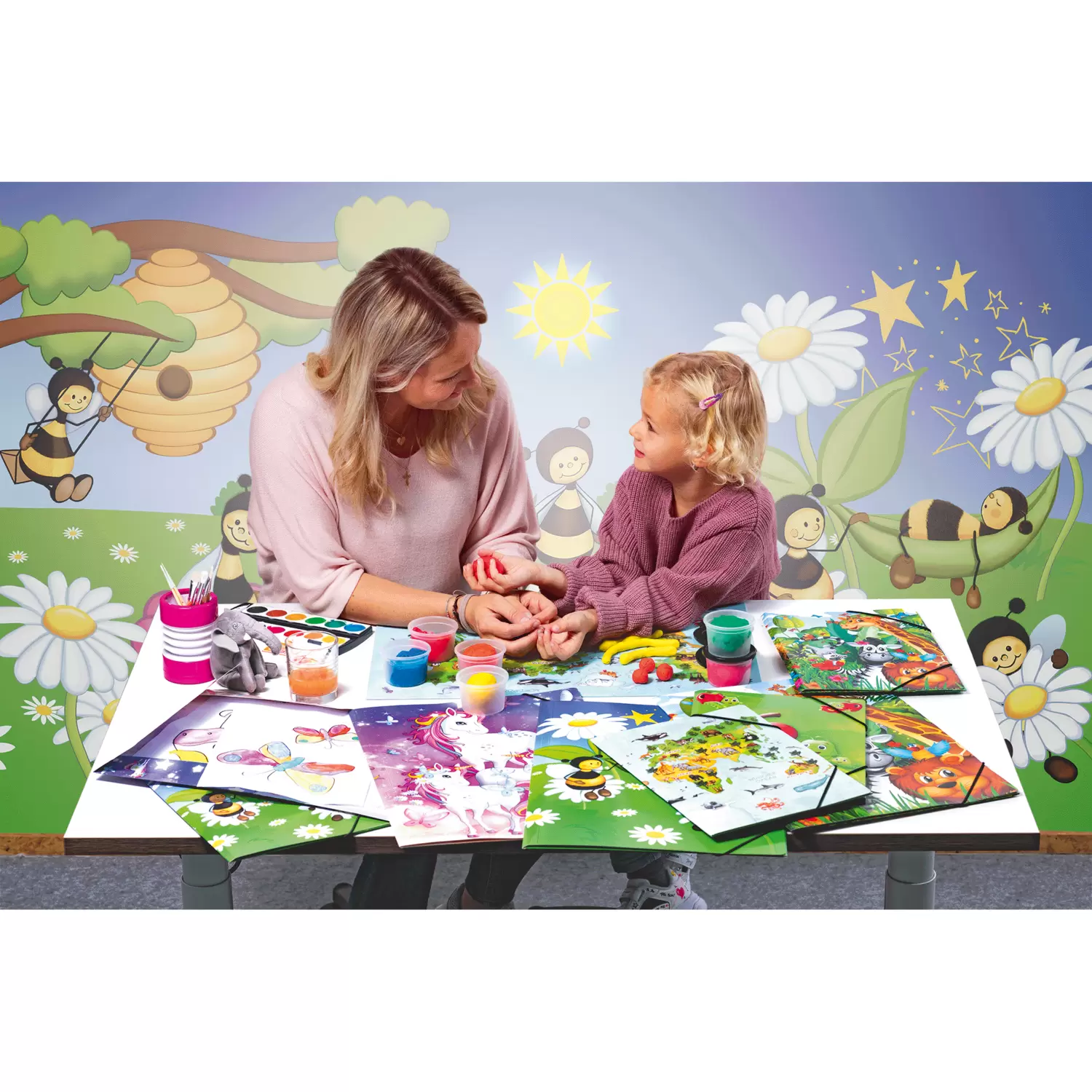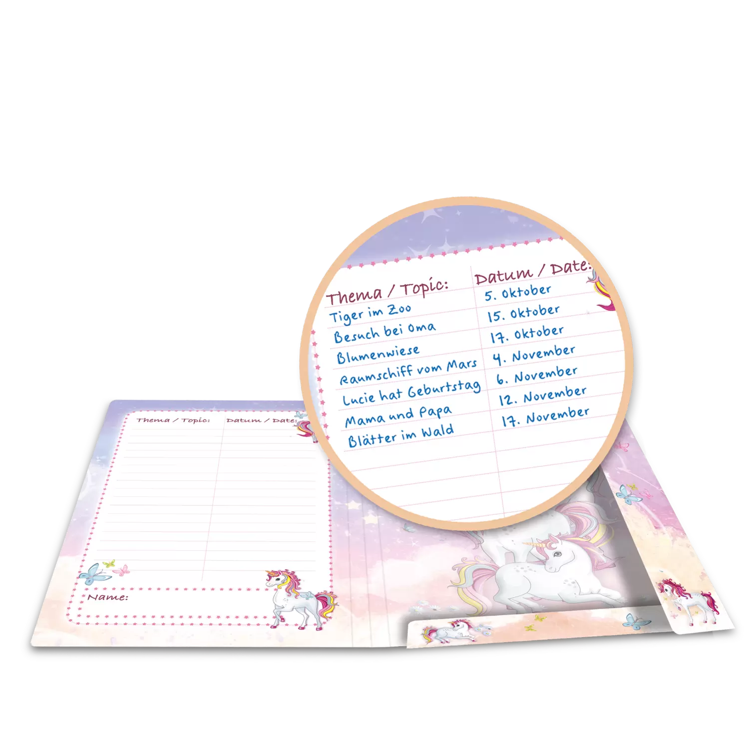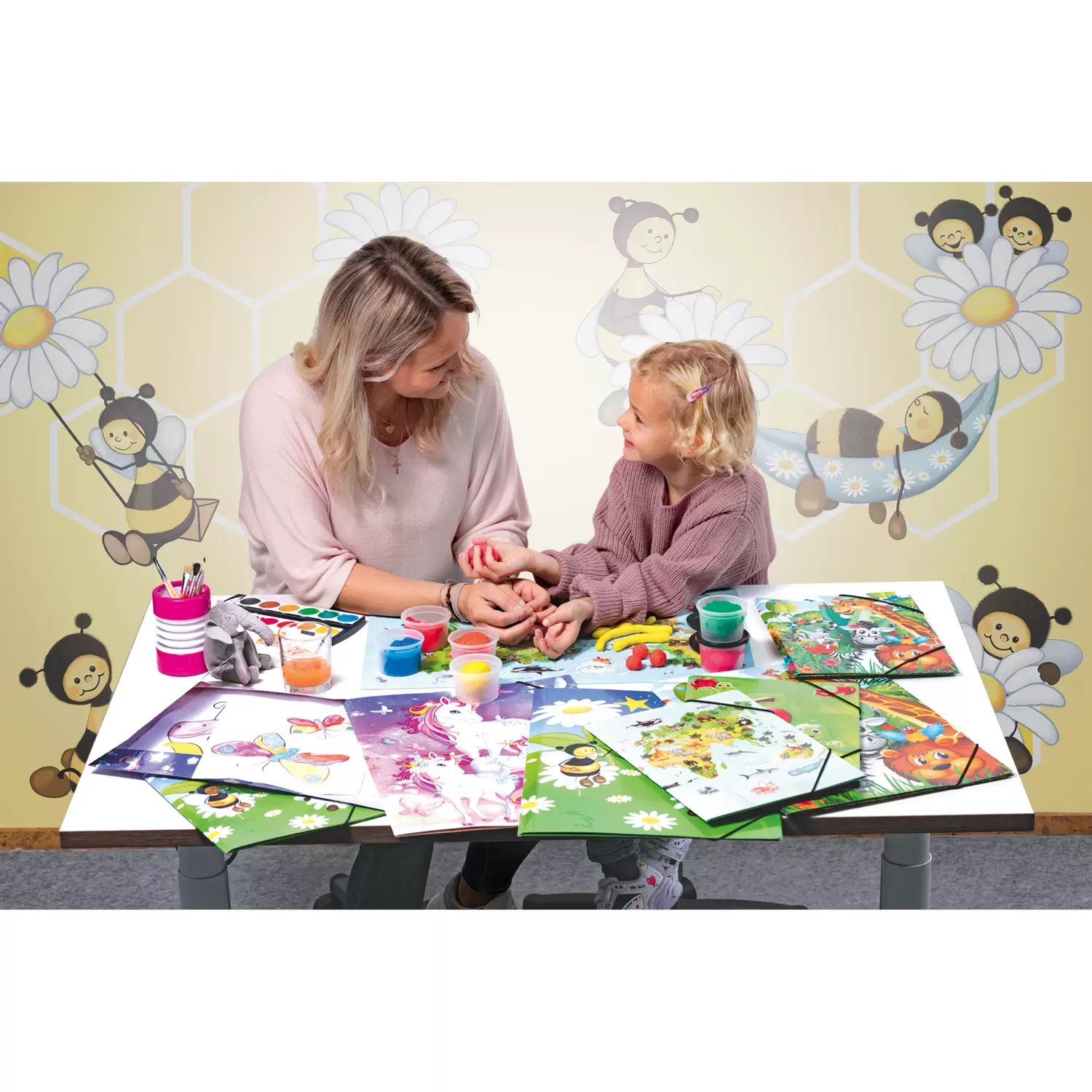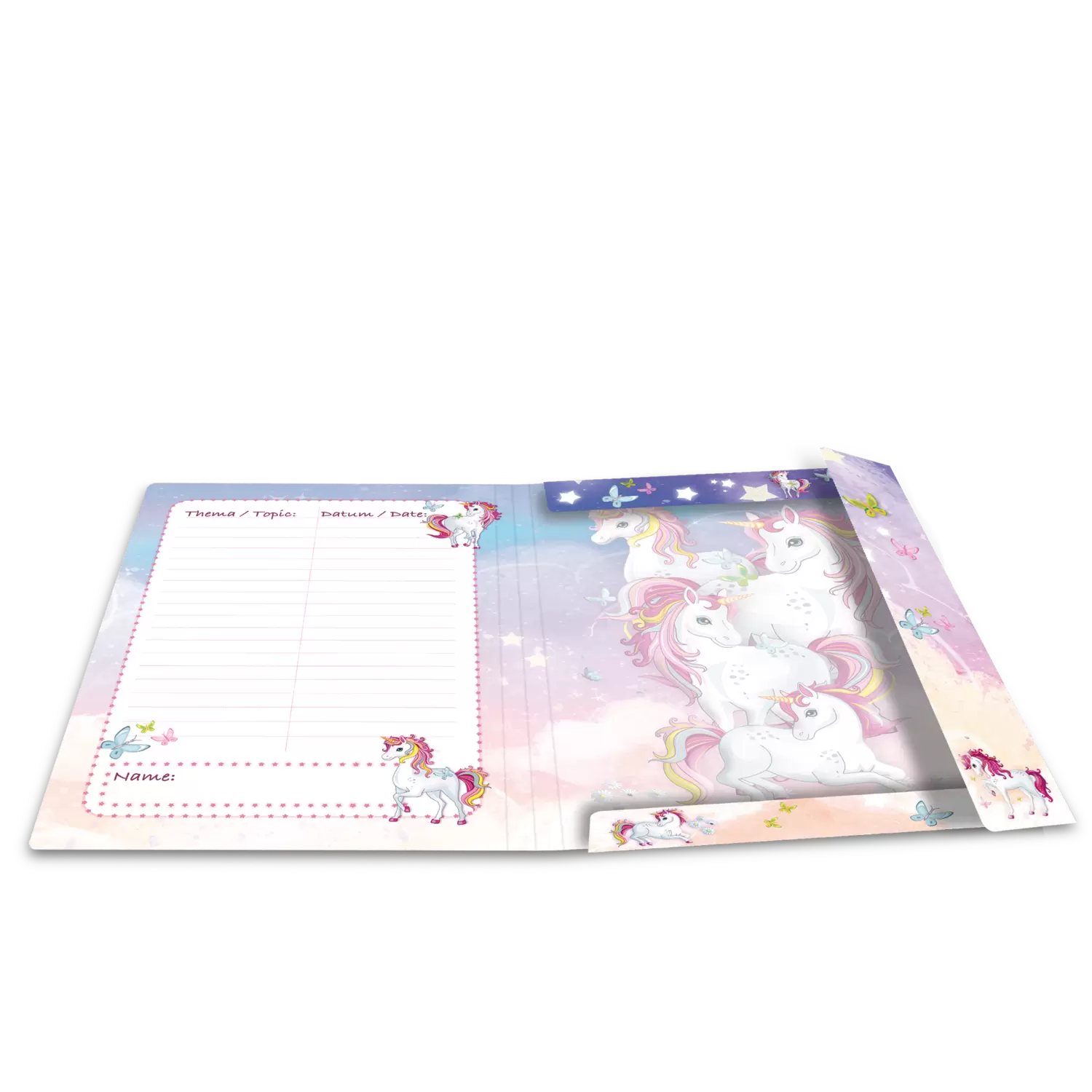 Eenhoorns zijn gewoon superschattig – van deze fabeldiertjes zijn zowel meisjes als jongens in de ban. Deze prachtige in zachte lila- en rosétinten uitgevoerde verzamelmap is dé hit voor alle eenhoorn-fans! De map meet 44 cm x 33,5 cm en is dus groot genoeg voor papieren, tekeningen en documenten tot DIN A3-formaat. Hij is gemaakt van stevig karton en dankzij twee hoogwaardige hoekspanners gemakkelijk te openen en te sluiten. Dankzij de drie binnenflappen wordt de inhoud beschermd en ook kleiner papierwerk kan er niet uit vallen.