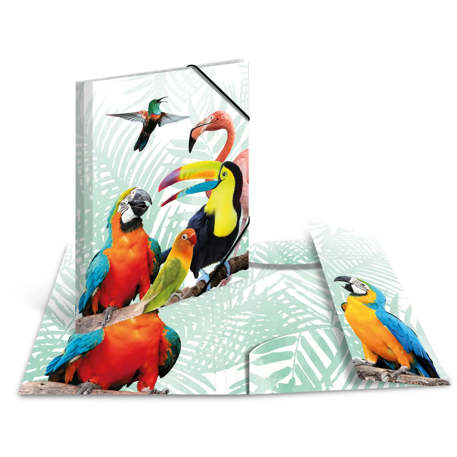 • Verzamelmap, design-serie 'exotische dieren', motief stelletje tropische vogels, lachend: snaterend, vrolijk en kleurig