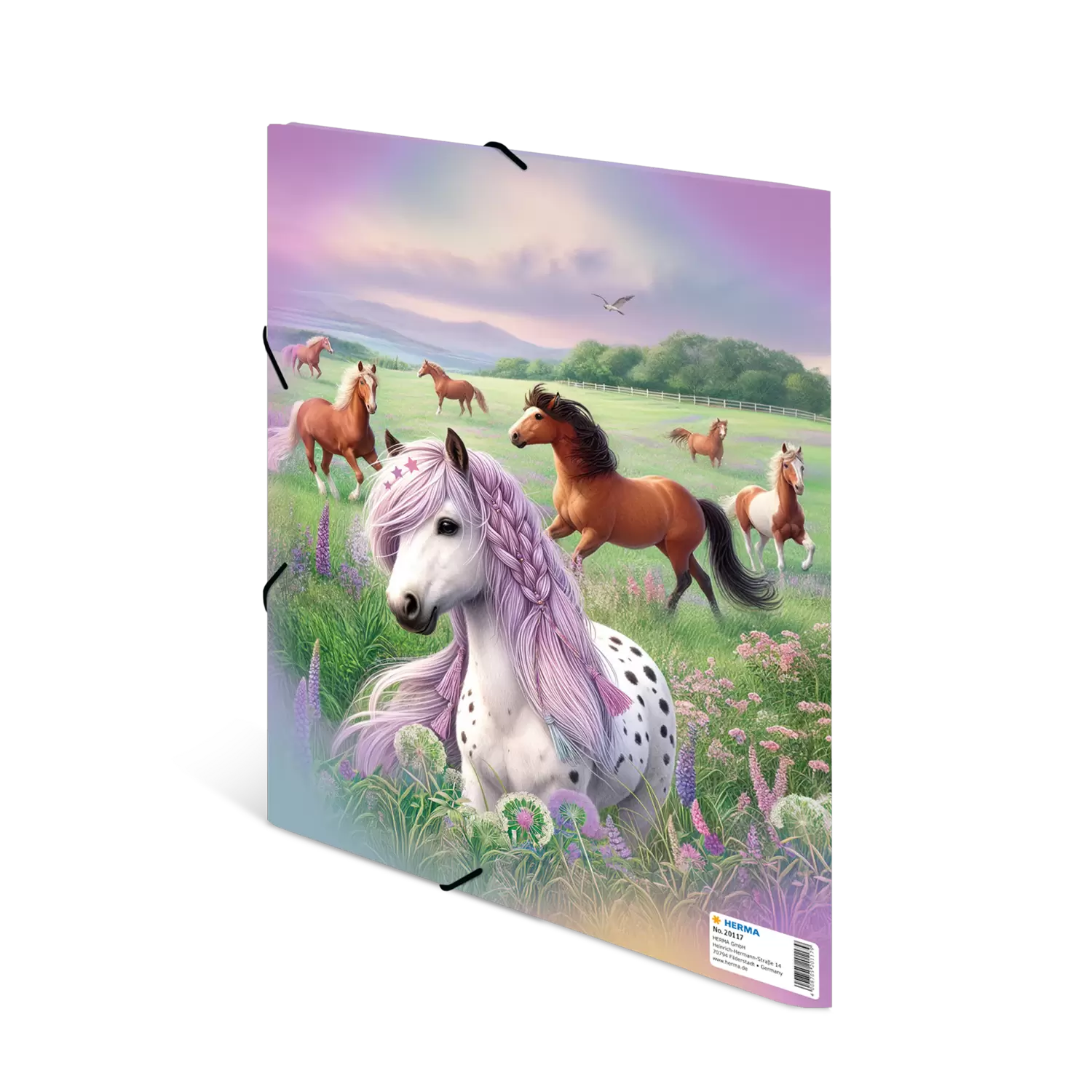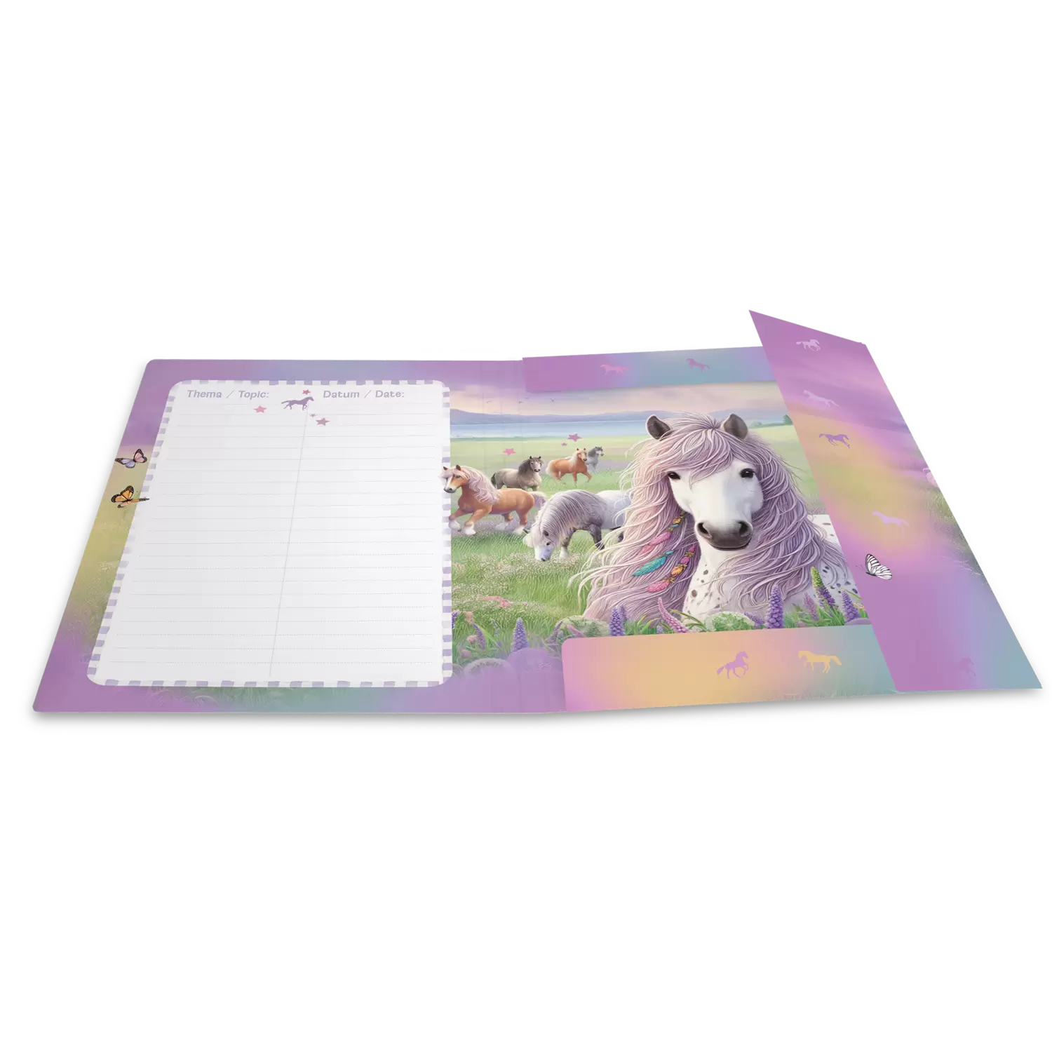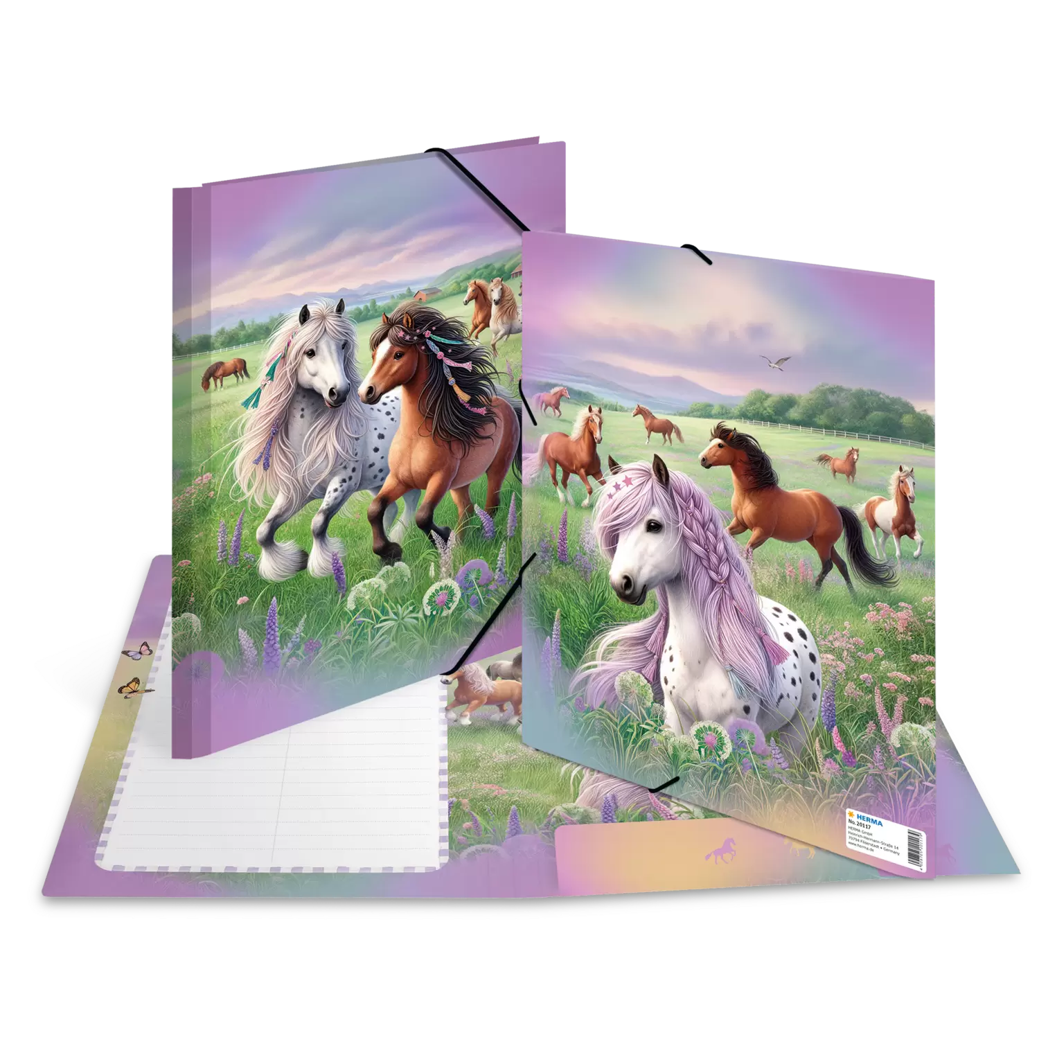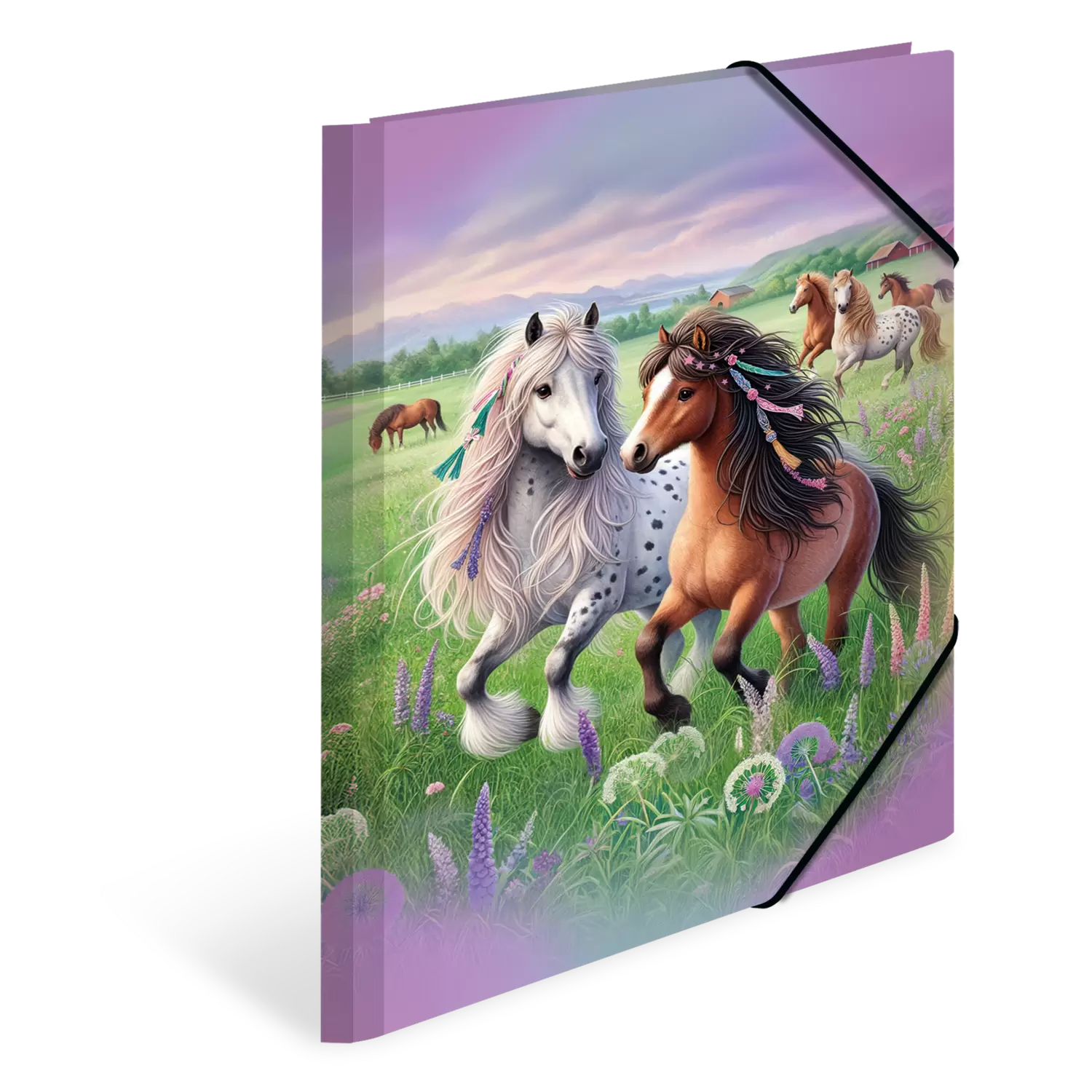 De verzamelmap "Paardenwereld" sleept je mee in een toverachtig mooi landschap, dat de harten van paardenfans sneller doet kloppen. Op de liefdevol gemaakte tekeningen zie je speels vormgegeven paarden met golvende manen met ingevlochten parels en kleurige linten. Op een bloeiende weide dartelen meerdere van deze prachtige dieren, omgeven door lila bloemen, die het beeld een romantische touch verlenen. De delicate, zachtlila hemel creëert een harmonische sfeer en nodigt uit tot dromen. Deze verzamelmap voor het formaat DIN A4 verenigt functionaliteit met een aansprekend design en is ideaal voor het bewaren van schoolpaperassen, creatieve projecten of persoonlijke herinneringen. De liefdevolle vormgeving straalt onbekommerdheid uit en geeft een gevoel van vrijheid en rust. De verzamelmap "Paardenwereld" geeft een beetje extra glans aan het leven van alledag en is perfect voor iedereen die liefhebber is van landelijke idylle en dol is op paarden. Een stijlvol accessoire voor kleine en grote paardenfans, dat de passie voor deze fantastische dieren op bijzondere wijze vasthoudt.