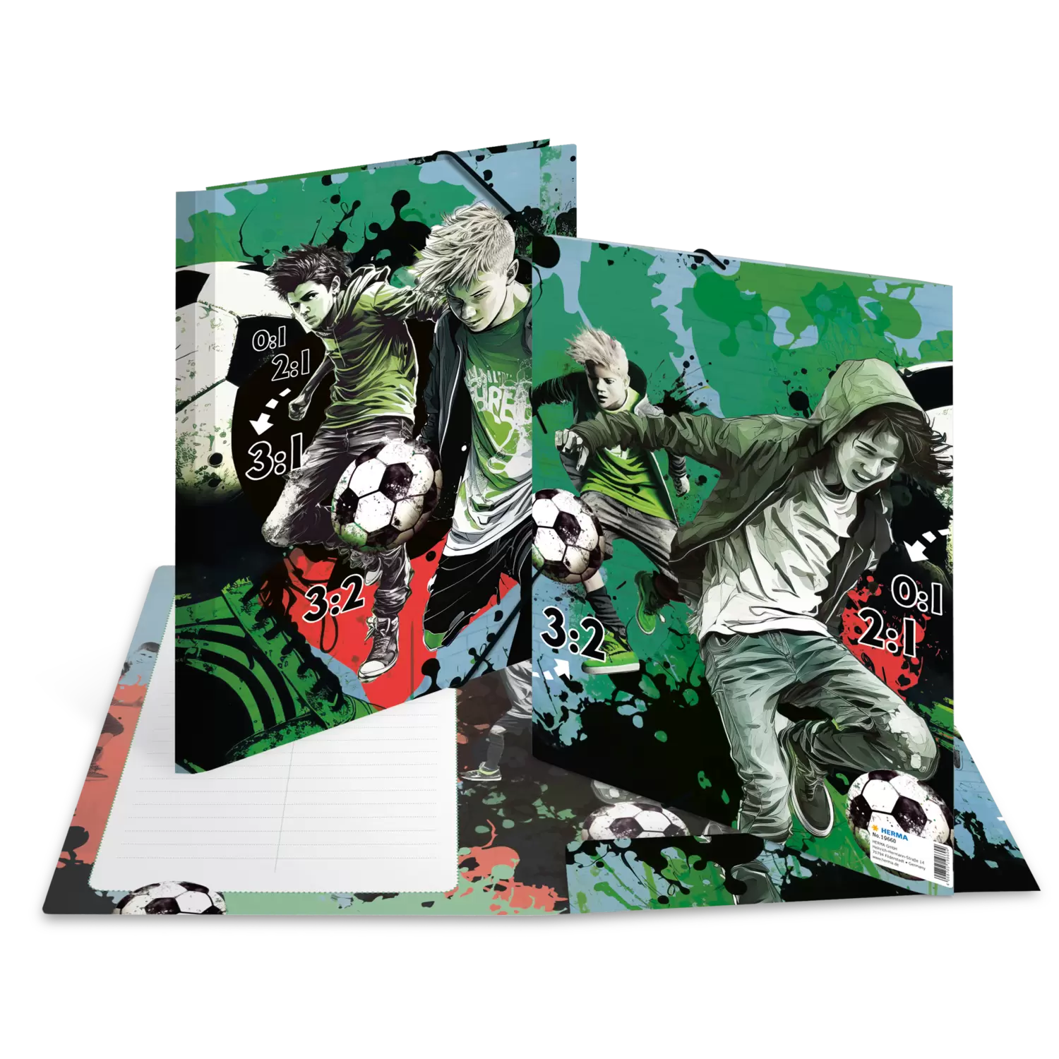 Voetbal is onze lust en ons leven! Maar alleen de diehards spelen op straat. Met zijn trendy ontwerp "Street Soccer" is deze verzamelmap een echte blikvanger die meteen uitnodigt een balletje te gaan trappen. Praktisch en robuust - dat is kwaliteit van HERMA. De map meet 32 cm x 24 cm en is dus groot genoeg voor papieren, tekeningen en documenten tot DIN A4-formaat. Hij is gemaakt van stevig karton en dankzij twee hoogwaardige hoekspanners gemakkelijk te openen en te sluiten. Dankzij de drie binnenflappen wordt de inhoud beschermd en ook kleiner papierwerk kan er niet uit vallen.