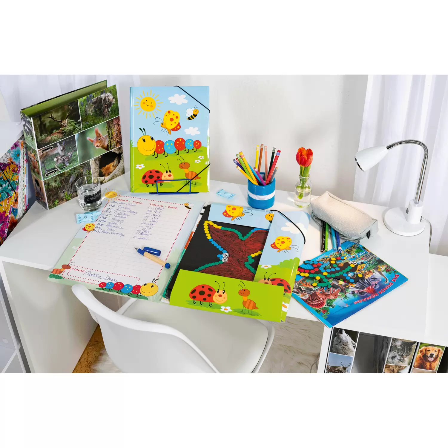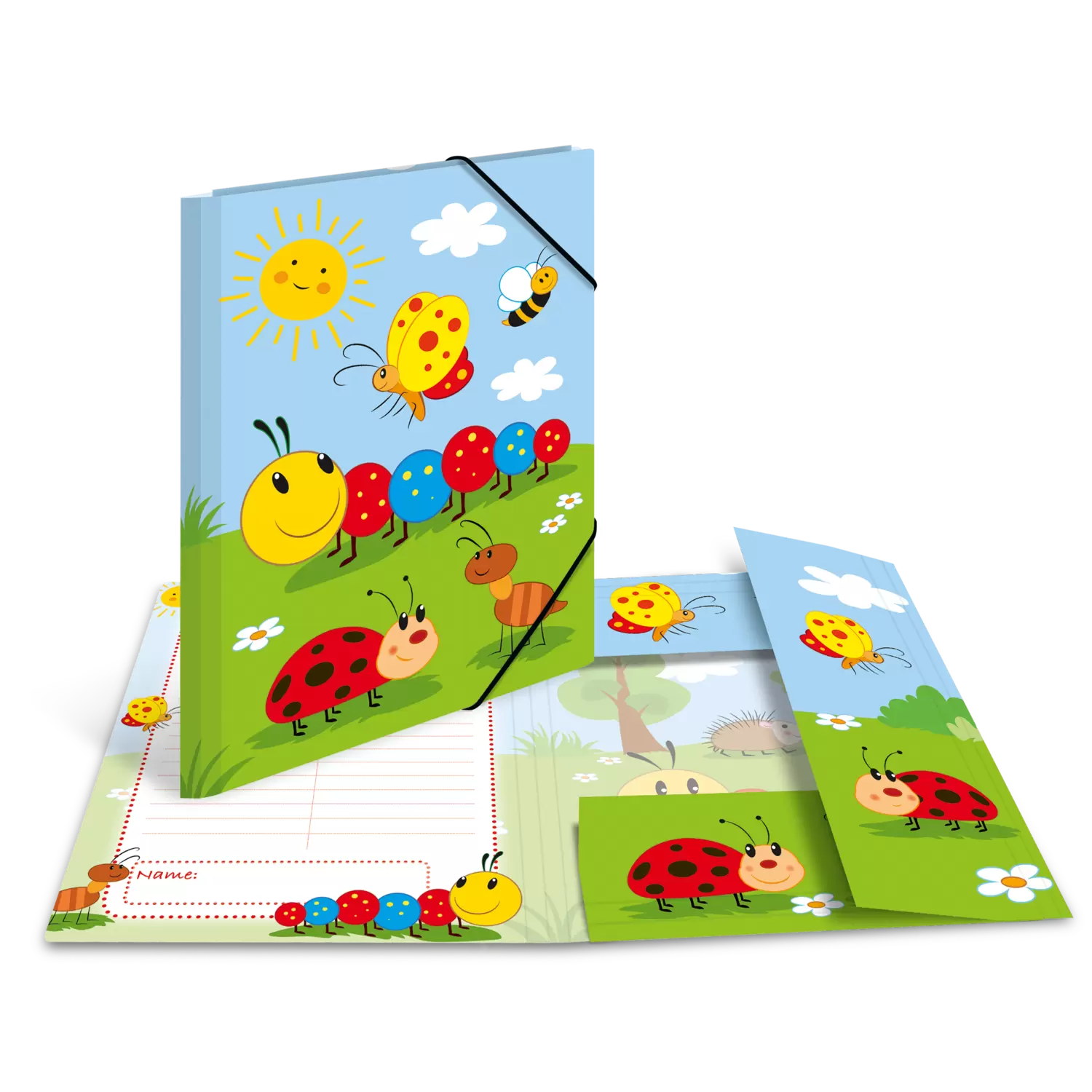 De HERMA verzamelmap met de schattige rups Frieda en haar vriendjes is dé ideale bewaaroplossing voor verzamelaars van tekeningen, schilderwerkjes en paperassen van DIN A4 formaat. De zelfgemaakte schi lderwerkjes kunnen zo gemakkelijk worden opgeborgen en veilig van school naar huis worden meegenomen. Deze map is vooral geliefd bij kinderen in de kleuterleeftijd en stimuleert ze door de uitnodigende vormgeving bij het sorteren en ordenen van hun spulletjes. De handige hoekspanners houden de inhoud van de map stevig bij elkaar en zorgen ervoor dat deze er niet uit kan vallen. Ook de drie geïntegreerde binnenflappen met opdruk beschermen de bladen en kunstwerkjes van de kleintjes tegen vies worden buiten of tegen morsvlekken van meegenomen eten en drinken. Het stevige karton, waarvan de opbergmap gemaakt is, is gemakkelijk afwasbaar en uiterst slijtvast. Het bijzondere aan deze map voor de kleintjes is de print aan de binnenkant met motief en register. Nu kan elk kunstwerkje worden gedocumenteerd, vastgelegd, geordend en op een manier die kinderen van deze leeftijd aanspreekt worden gepresenteerd. Onderaan de rand bevindt zich een naamveld om de map te kunnen personaliseren. Met de handige "Frieda & Friends" verzamelmap is het voor u en uw kind nu heel gemakkelijk om veel verschillende werkbladen, tekeningen en kunstwerkjes meteen weg te bergen, zonder dat ze in de schooltas, rugzak of in de kinderkamer rondslingeren, ezelsoren krijgen of zelfs kwijtraken. Ordenen en overzicht houden is vanaf nu een fluitje van een cent.