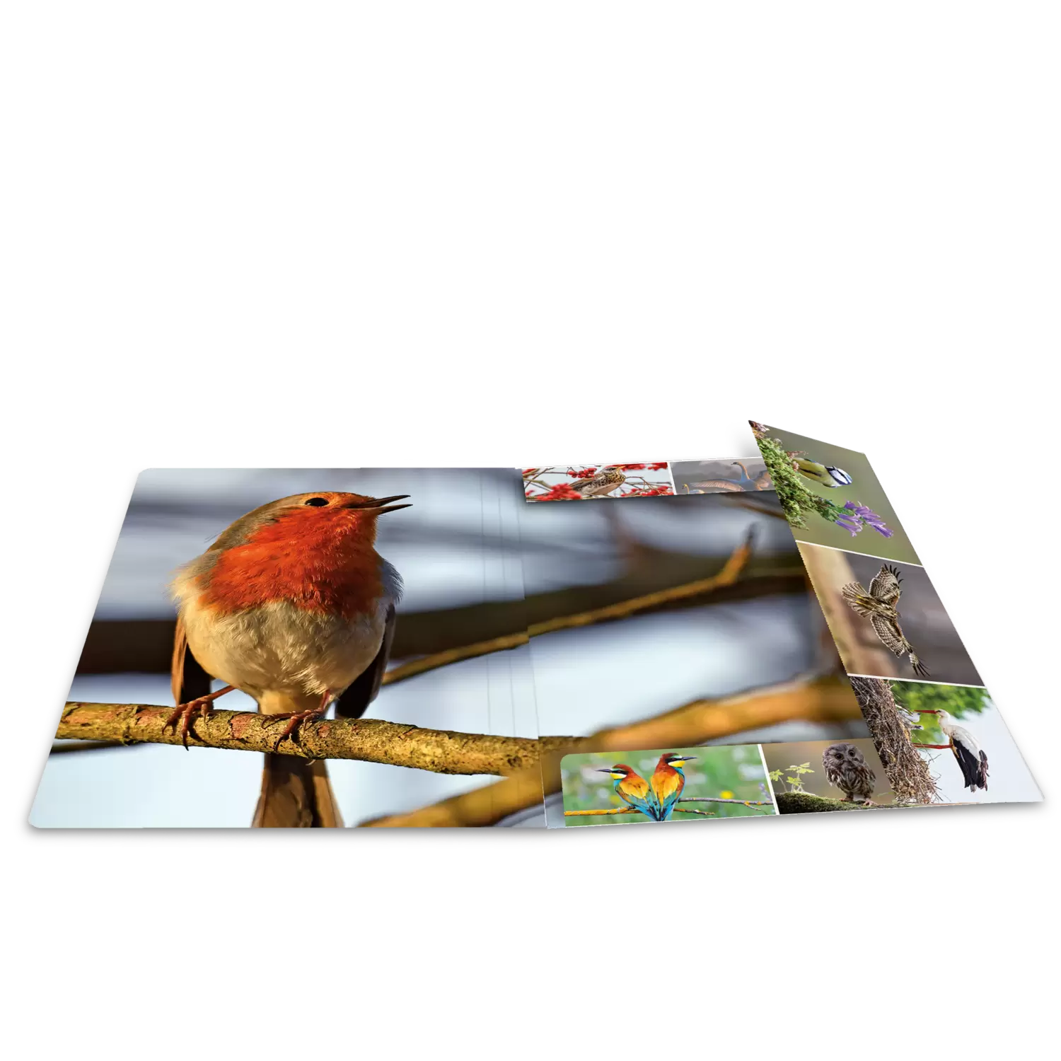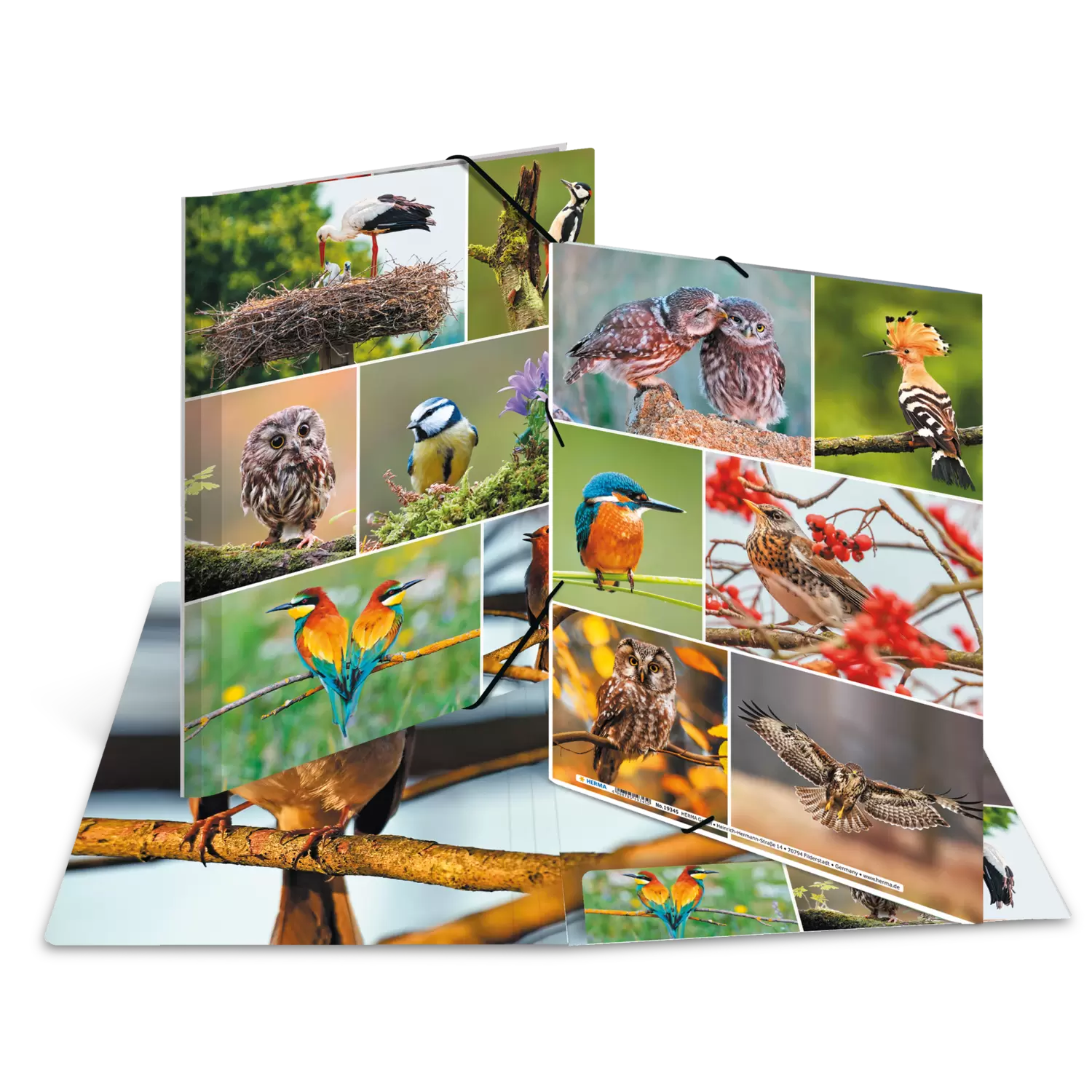 Vogelvrienden opgelet! Wie dol is op vogels en graag zijn tijd met een verrekijker doorbrengt in de natuur, in het bos of buiten in het veld om vogels te spotten, zal veel plezier beleven aan deze verzamelmap, die aan de binnen- en buitenkant bedrukt is met veel verschillende foto's van vogels. De map meet 32 cm x 24 cm en is dus groot genoeg voor papieren, tekeningen en documenten tot DIN A4-formaat. Hij is gemaakt van stevig karton en dankzij twee hoogwaardige hoekspanners gemakkelijk te openen en te sluiten. Dankzij de drie binnenflappen wordt de inhoud beschermd en ook kleiner papierwerk kan er niet uit vallen.