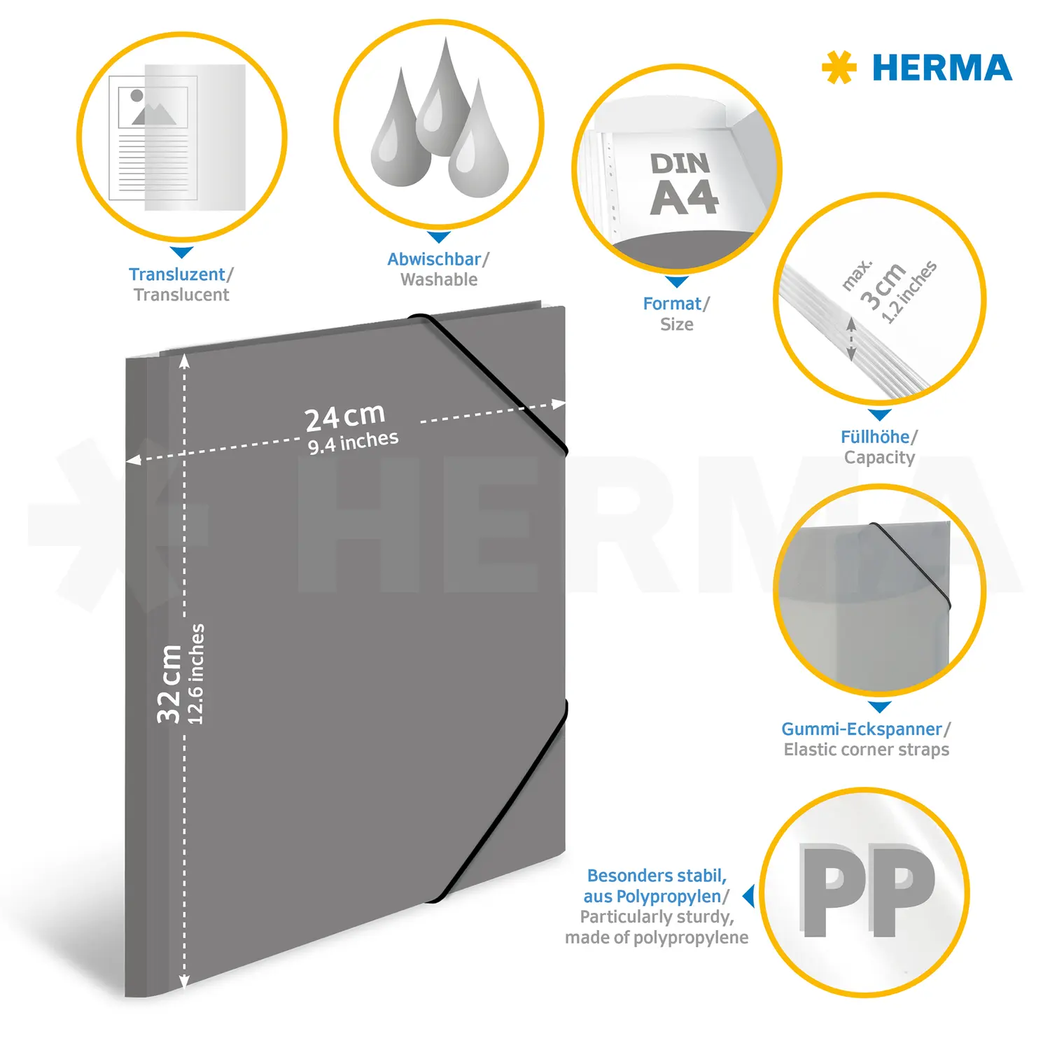 - Van stevig polypropyleen, afwasbaar en robuust – ideaal voor het opbergen van losse paperassen