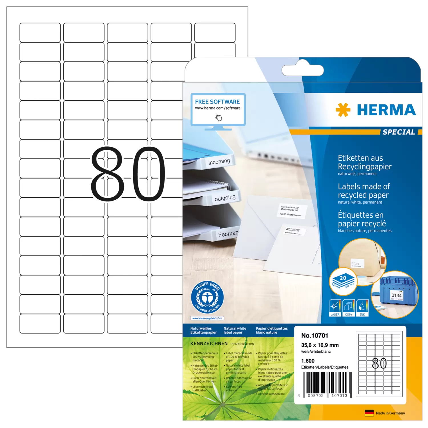 Zelfklevende etiketten van natuurlijk wit gerecycled papier, op A4-vellen. Draagt het milieukeurmerk der blaue engel. Ideaal voor het adresseren en labelen. Etikettenpapier van 100% gerecycled papier. Hoge witheidsgraad (ISO 97/CIE 133), zonder chloorbleek. Oplosmiddelvrije contactlijm op waterbasis. Etiketten zijn 100% recyclebaar via het oud papier, verpakking van gerecycled karton. Storingvrije verwerking dankzij veiligheidsrand rondom en optimale vlakligging. Zeer goede drukresultaten op alle laser- en inkjetprinters, kopieerapparaten, kleurenlaserprinters en kleurenkopieerapparaten. Gratis softwareoplossingen: www.herma.com/software.
