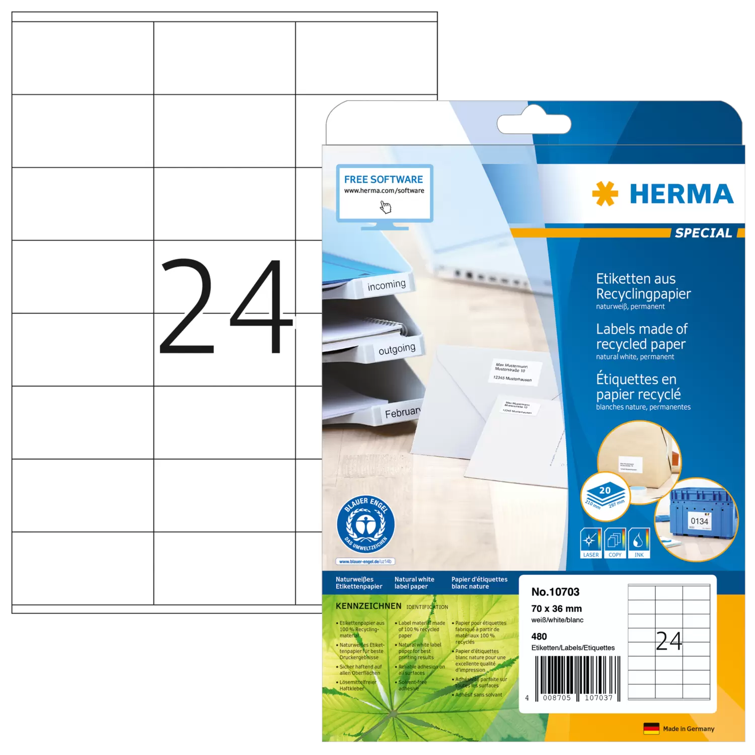 Etiketten van gerecycled papier, A4, 70 x 36 mm, wit, permanent hechtend