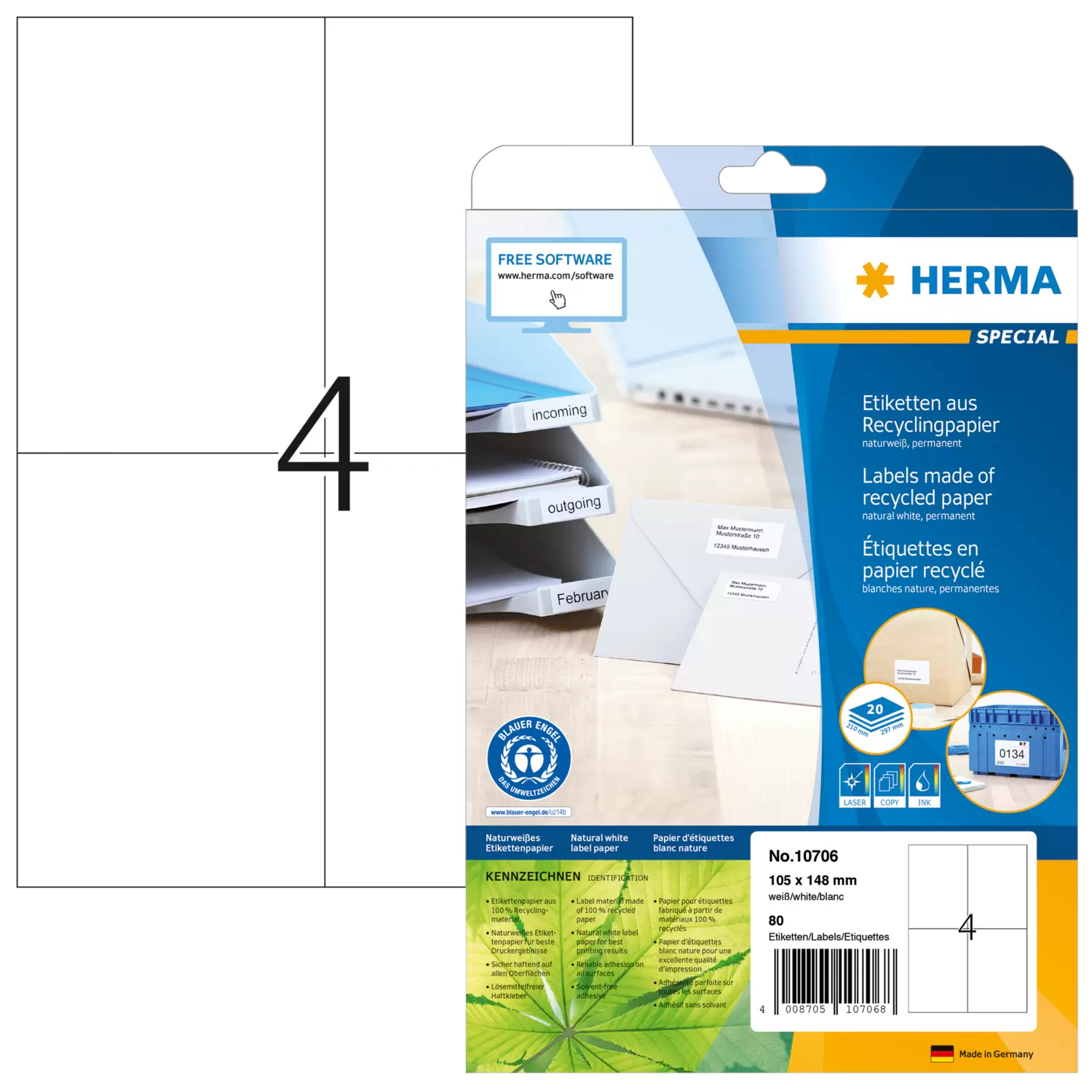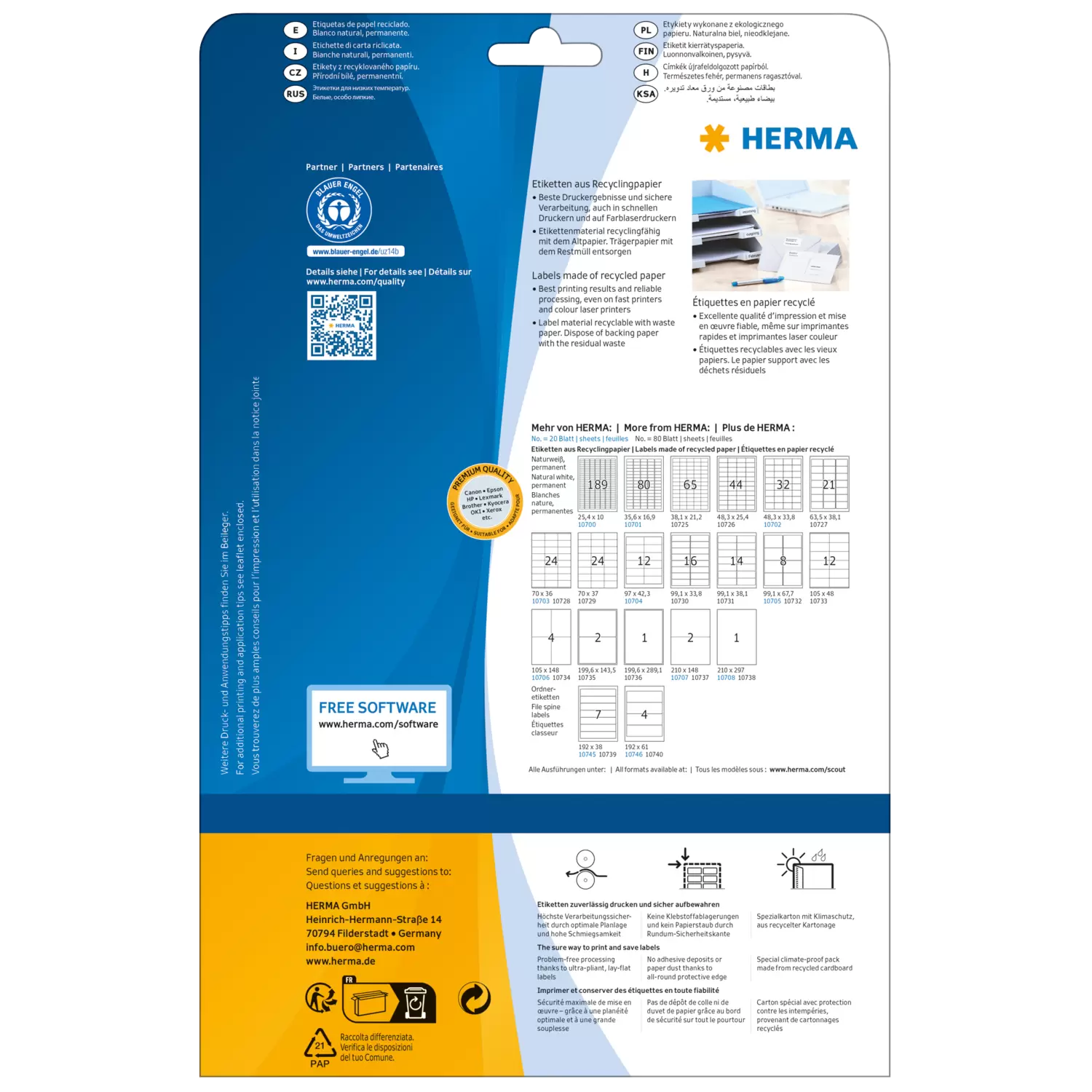Zelfklevende etiketten van natuurlijk wit gerecycled papier, op A4-vellen. Draagt het milieukeurmerk der blaue engel. Ideaal voor het adresseren en labelen. Etikettenpapier van 100% gerecycled papier. Hoge witheidsgraad (ISO 97/CIE 133), zonder chloorbleek. Oplosmiddelvrije contactlijm op waterbasis. Etiketten zijn 100% recyclebaar via het oud papier, verpakking van gerecycled karton. Storingvrije verwerking dankzij veiligheidsrand rondom en optimale vlakligging. Zeer goede drukresultaten op alle laser- en inkjetprinters, kopieerapparaten, kleurenlaserprinters en kleurenkopieerapparaten. Gratis softwareoplossingen: www.herma.com/software.