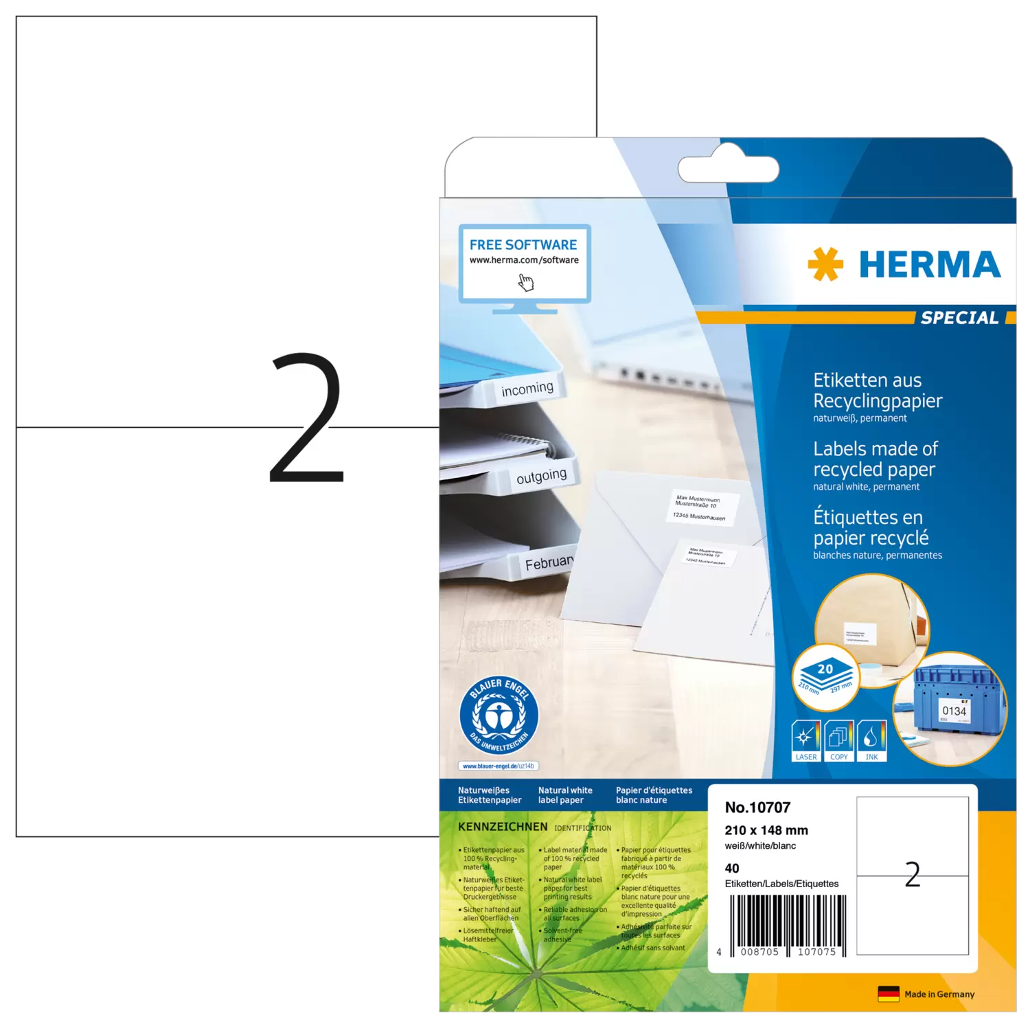 Zelfklevende etiketten van natuurlijk wit gerecycled papier, op A4-vellen. Draagt het milieukeurmerk der blaue engel. Ideaal voor het adresseren en labelen. Etikettenpapier van 100% gerecycled papier. Hoge witheidsgraad (ISO 97/CIE 133), zonder chloorbleek. Oplosmiddelvrije contactlijm op waterbasis. Etiketten zijn 100% recyclebaar via het oud papier, verpakking van gerecycled karton. Storingvrije verwerking dankzij veiligheidsrand rondom en optimale vlakligging. Zeer goede drukresultaten op alle laser- en inkjetprinters, kopieerapparaten, kleurenlaserprinters en kleurenkopieerapparaten. Gratis softwareoplossingen: www.herma.com/software.
