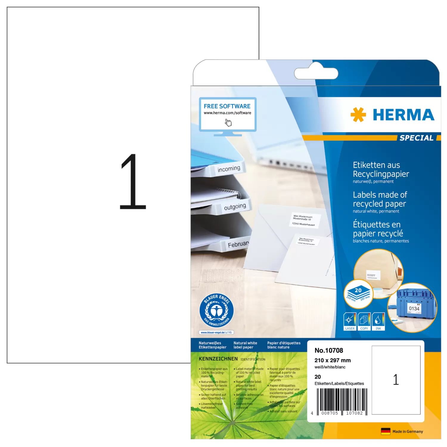 Etiketten van gerecycled papier, A4, 210 x 297 mm, wit, permanent hechtend