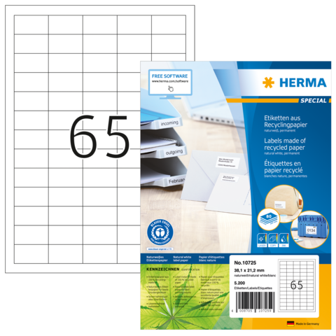Recycling-etiketten zijn in tegenstelling tot andere etiketten voor 100% gemaakt van gerecycled papier en zijn onderscheiden met het milieukeurmerk 'Der Blaue Engel'. Bovendien is de verpakking van de etiketten gemaakt van gerecycled karton.