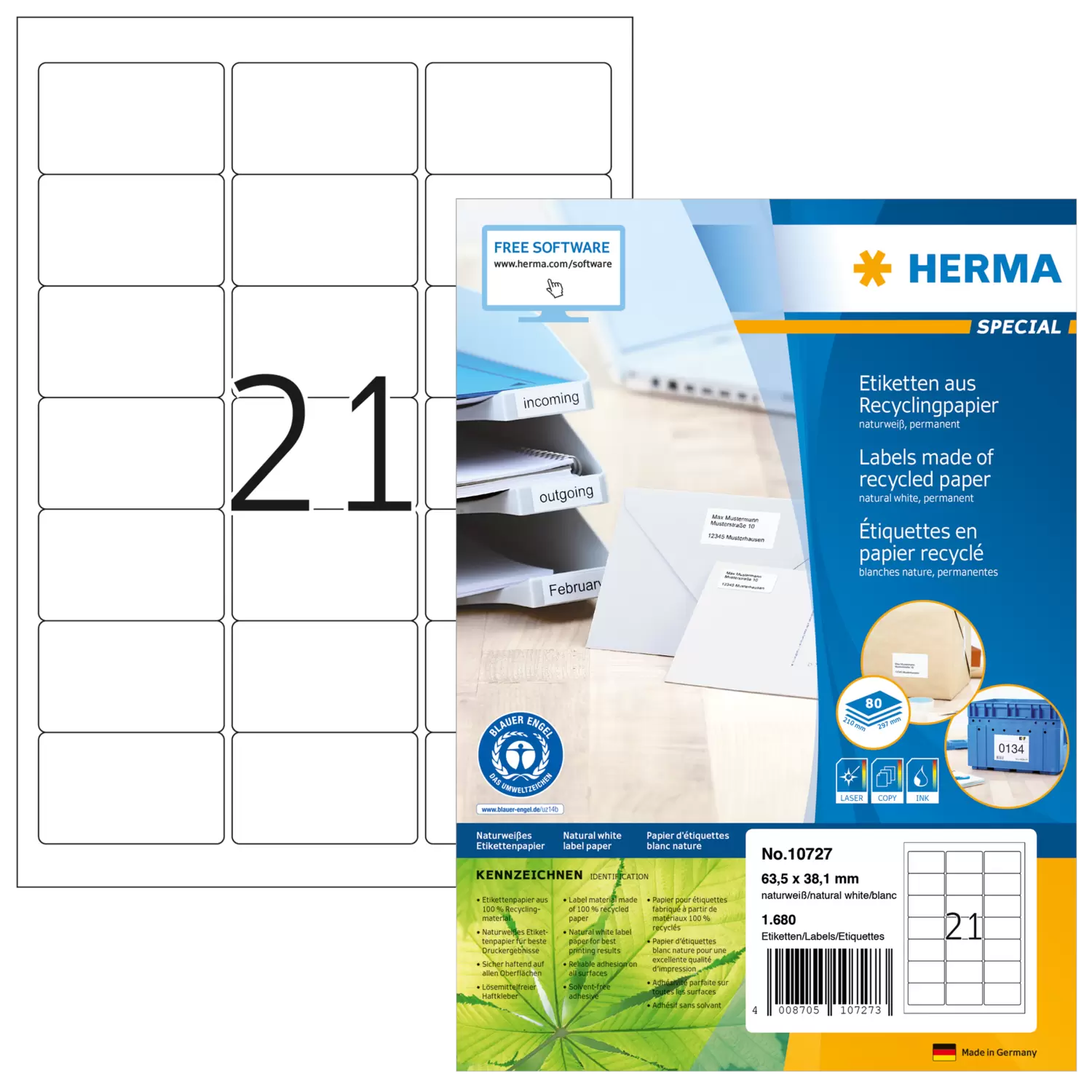 Zelfklevende etiketten van natuurlijk wit gerecycled papier, op A4-vellen. Draagt het milieukeurmerk der blaue engel. Ideaal voor het adresseren en labelen. Etikettenpapier van 100% gerecycled papier. Hoge witheidsgraad (ISO 97/CIE 133), zonder chloorbleek. Oplosmiddelvrije contactlijm op waterbasis. Etiketten zijn 100% recyclebaar via het oud papier, verpakking van gerecycled karton. Storingvrije verwerking dankzij veiligheidsrand rondom en optimale vlakligging. Zeer goede drukresultaten op alle laser- en inkjetprinters, kopieerapparaten, kleurenlaserprinters en kleurenkopieerapparaten. Gratis softwareoplossingen: www.herma.com/software.
