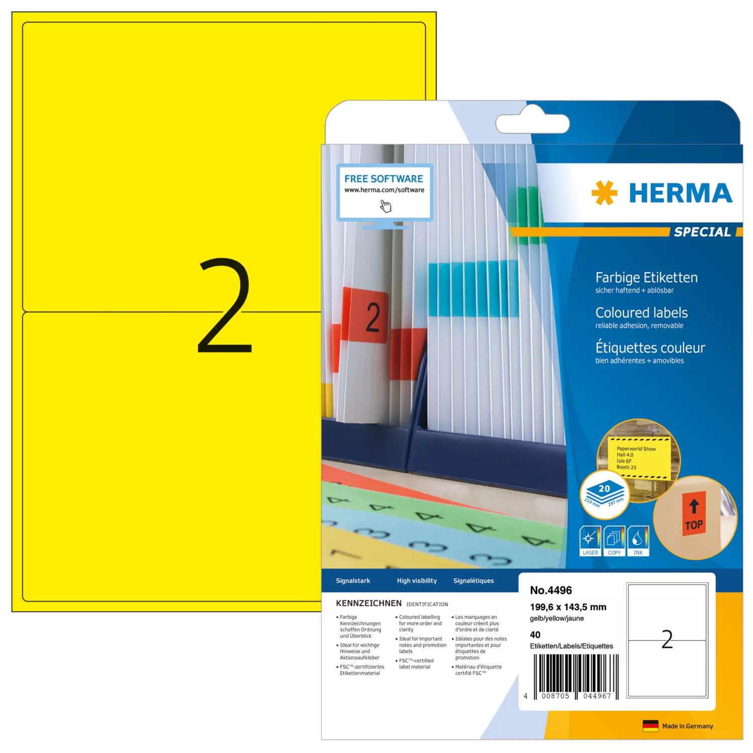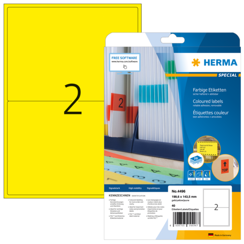 Gekleurde etiketten, A4, 199,6 x 143,5 mm, geel, verwijderbaar