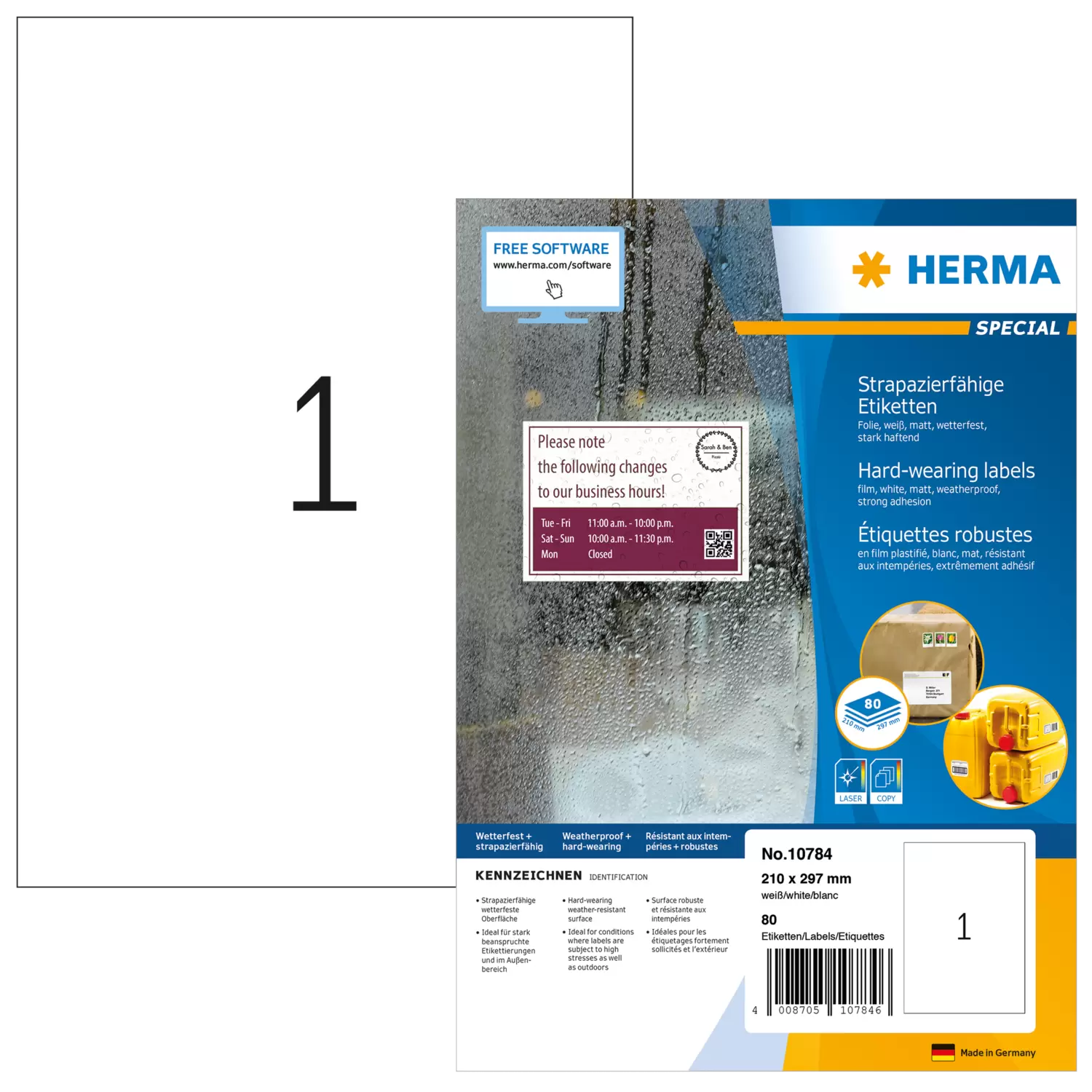 Mat witte folie-etiketten op A4-vellen, zelfklevend. Ideaal voor etiketten op zwaar belaste plaatsen en buiten: eigendomsetiketten, etalagestickers, attentie- en waarschuwingsplaatjes, labelen in het magazijn en in de productie. Slijt- en weervast oppervlak, zeer sterk hechtend, verouderingsbestendig, olie en vuil afstotend, afwasbaar, temperatuurbestendig van -30 tot 80 °C, zeewaterbestendig. Storingvrije verwerking dankzij veiligheidsrand rondom en optimale vlakligging. Voor laserprinters en kopieerapparaten, kleurenlaserprinters en kleurenkopieerapparaten. Niet geschikt voor inkjetprinters. Gratis softwareoplossingen: www.herma.com/software.