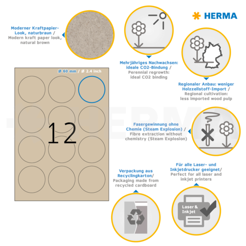 Het speciale papier gemaakt van de koningin van de ecologische gewassen – de Donau Silphie. Habitat voor bijen, voor energiewinning, ideale CO2-vastlegging en een meerwaarde voor het ecosysteem. Een bijdrage aan duurzaamheid. FSC® Mix Credit-gecertificeerd. Teelt in Duitsland, korte transportwegen, minder CO2-uitstoot. Moderne kraftpapier-look, van ten minste 35% silphie-vezels. Geschikt voor direct contact met levensmiddelen. Etikettenpapier recyclebaar via het oud papier. Van etiket tot verkoopverpakking: rondom duurzaam. Zeer goede drukresultaten op alle laser- en inkjetprinters, kopieerapparaten, kleurenlaserprinters en kleurenkopieerapparaten. Gratis softwareoplossingen: www.herma.com/software.