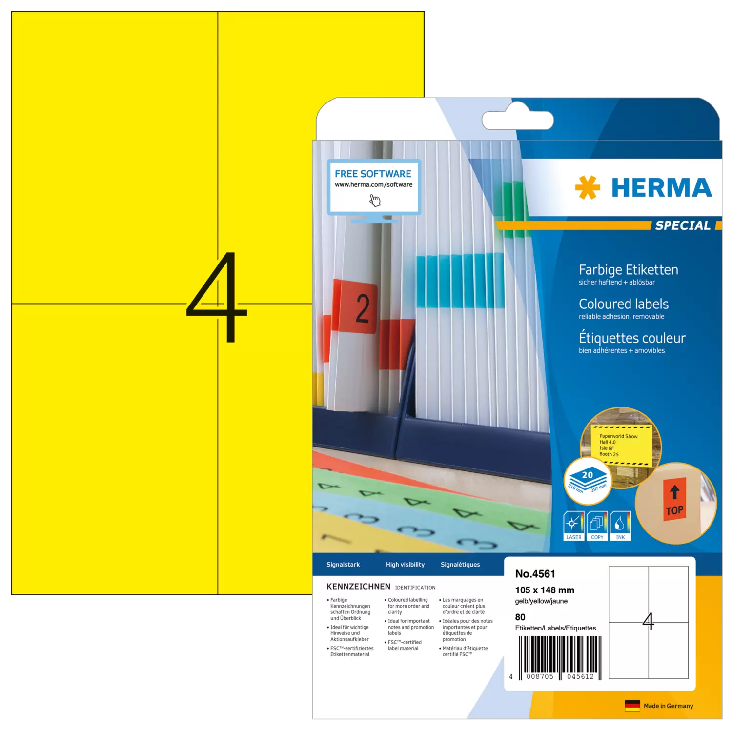 Gekleurde etiketten, A4, 105 x 148 mm, geel, verwijderbaar