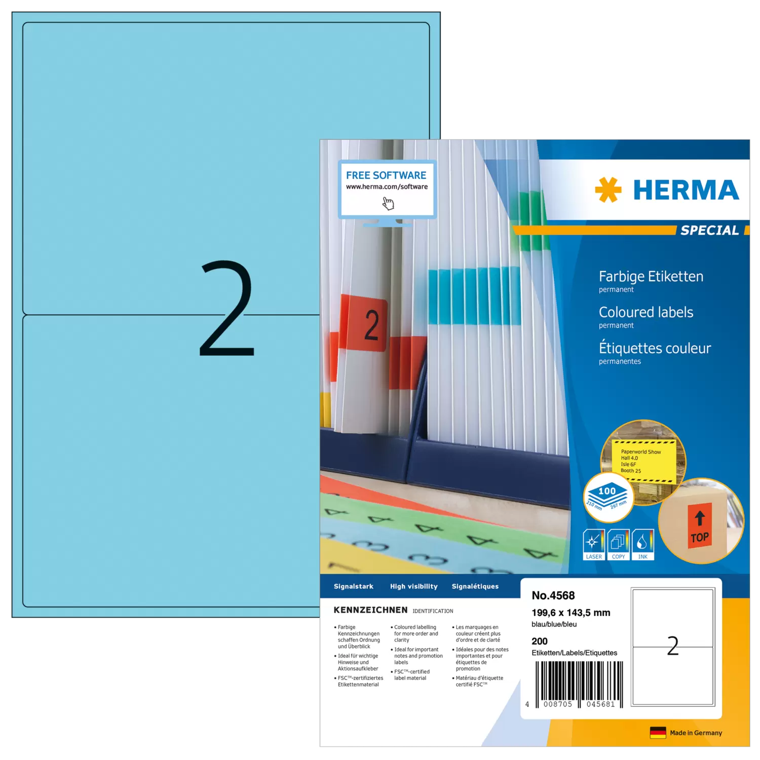 Gekleurde etiketten, A4, 199,6 x 143,5 mm, blauw, permanent hechtend