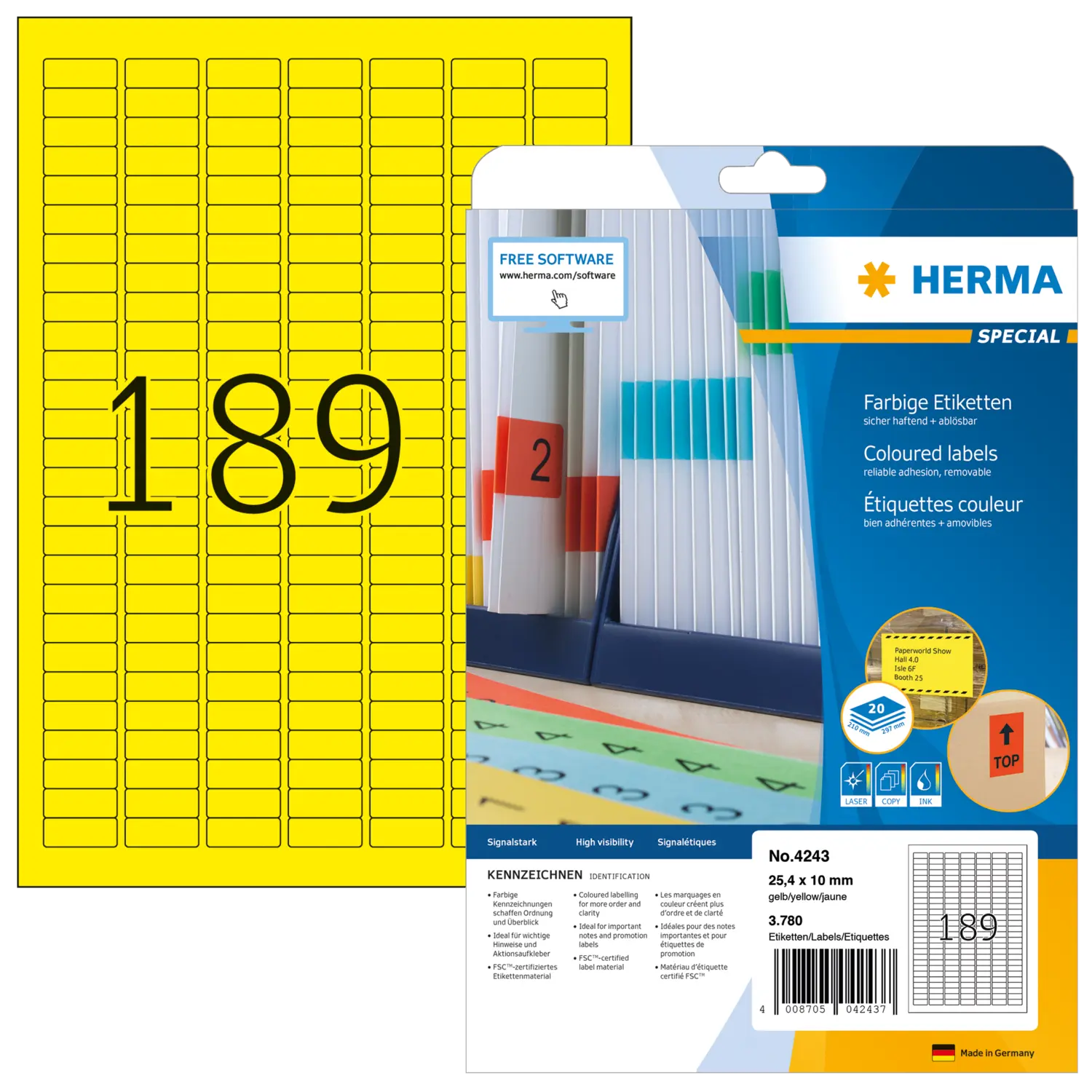 Gekleurde etiketten, A4, 25,4 x 10 mm, geel, verwijderbaar