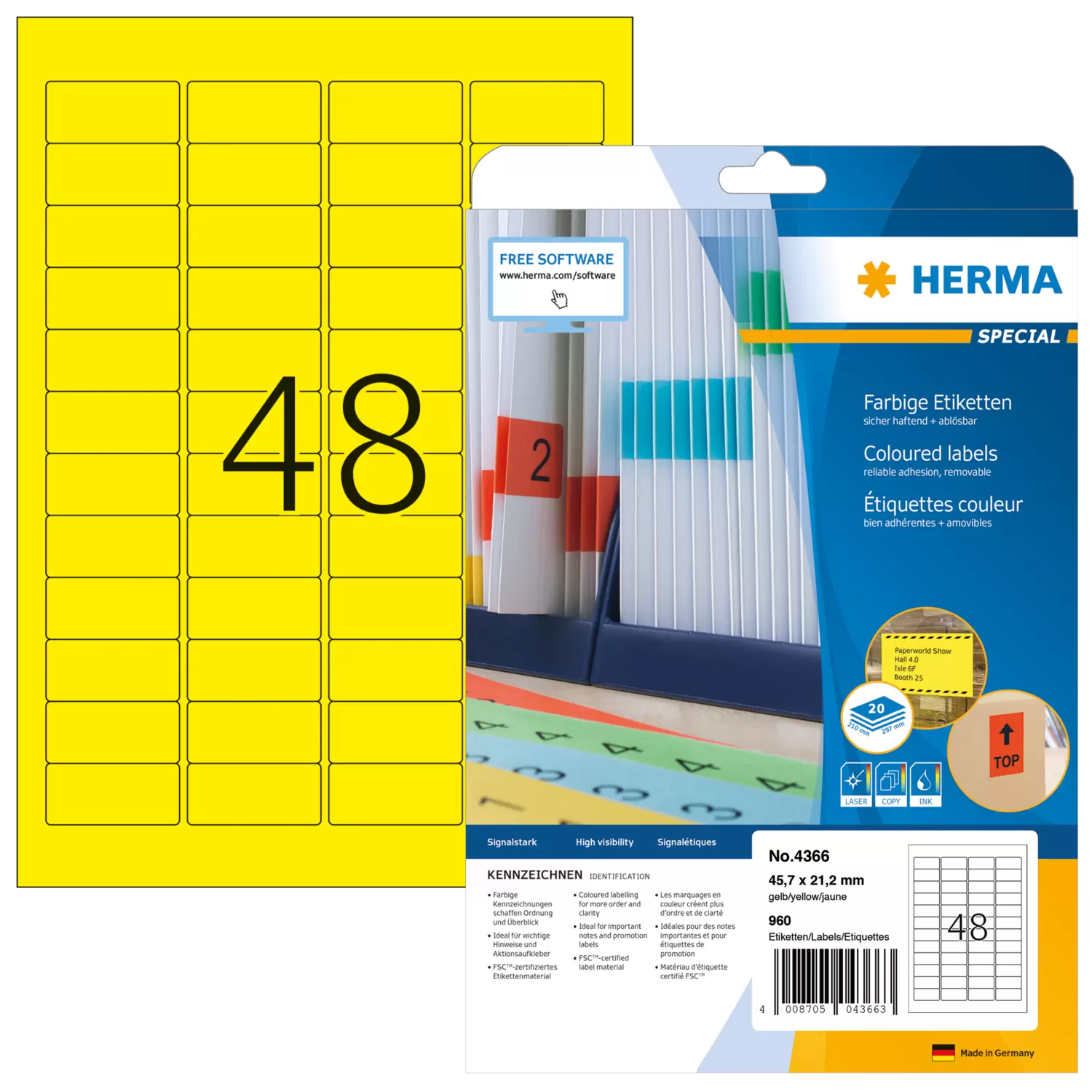 Gekleurde etiketten op A4-vellen, zelfklevend. Ideaal voor het labelen met signaalfunctie, bijv. waarschuwingsstickers, spoedaantekeningen, adreswijzigingen, kleurcodering, acties. Milieuvriendelijk: FSC® Mix Credit-gecertificeerd, chloorvrij gebleekt, oplosmiddelvrije contactlijm. Etiketten zijn 100 % recyclebaar via het oud papier, verpakking van gerecycled karton. Zeer goede drukresultaten op alle laser- en inkjetprinters, kopieerapparaten, kleurenlaserprinters en kleurenkopieerapparaten. Storingvrije verwerking dankzij veiligheidsrand rondom en optimale vlakligging. Gratis softwareoplossingen: www.herma.com/software.