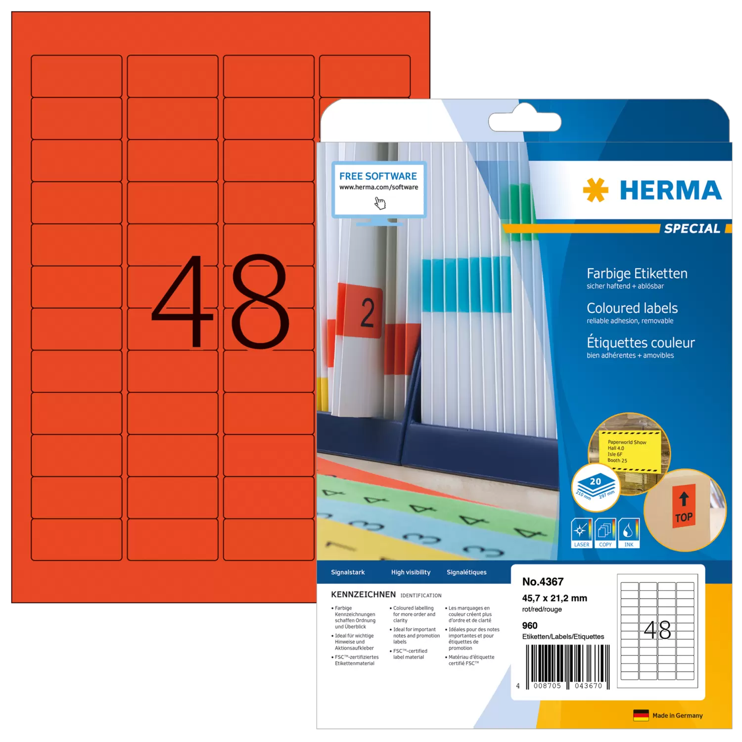 Gekleurde etiketten, A4, 45,7 x 21,2 mm, rood, verwijderbaar