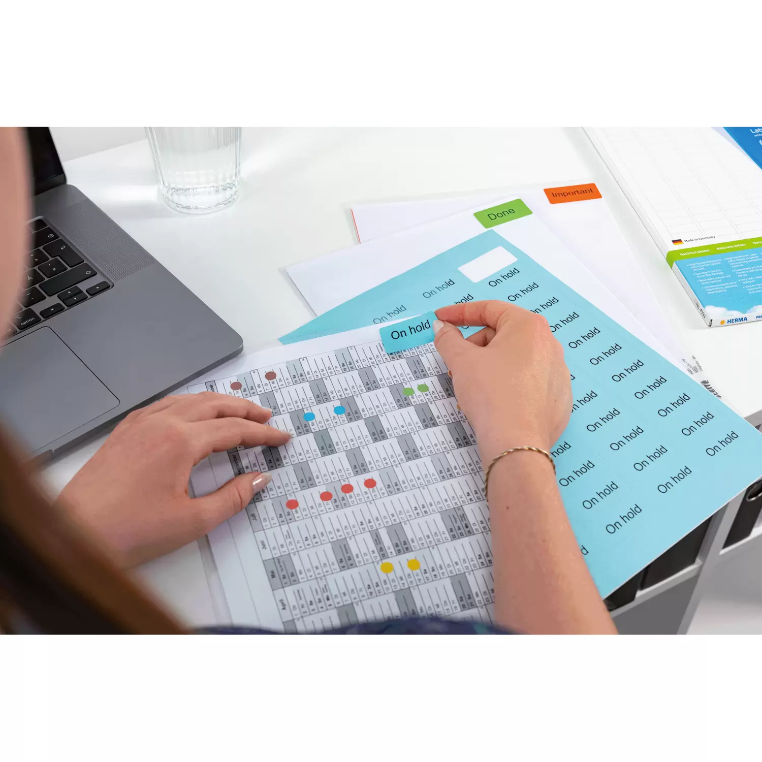 Gekleurde etiketten op A4-vellen, zelfklevend. Ideaal voor het labelen met signaalfunctie, bijv. waarschuwingsstickers, spoedaantekeningen, adreswijzigingen, kleurcodering, acties. Milieuvriendelijk: FSC® Mix Credit-gecertificeerd, chloorvrij gebleekt, oplosmiddelvrije contactlijm. Etiketten zijn 100 % recyclebaar via het oud papier, verpakking van gerecycled karton. Zeer goede drukresultaten op alle laser- en inkjetprinters, kopieerapparaten, kleurenlaserprinters en kleurenkopieerapparaten. Storingvrije verwerking dankzij veiligheidsrand rondom en optimale vlakligging. Gratis softwareoplossingen: www.herma.com/software.