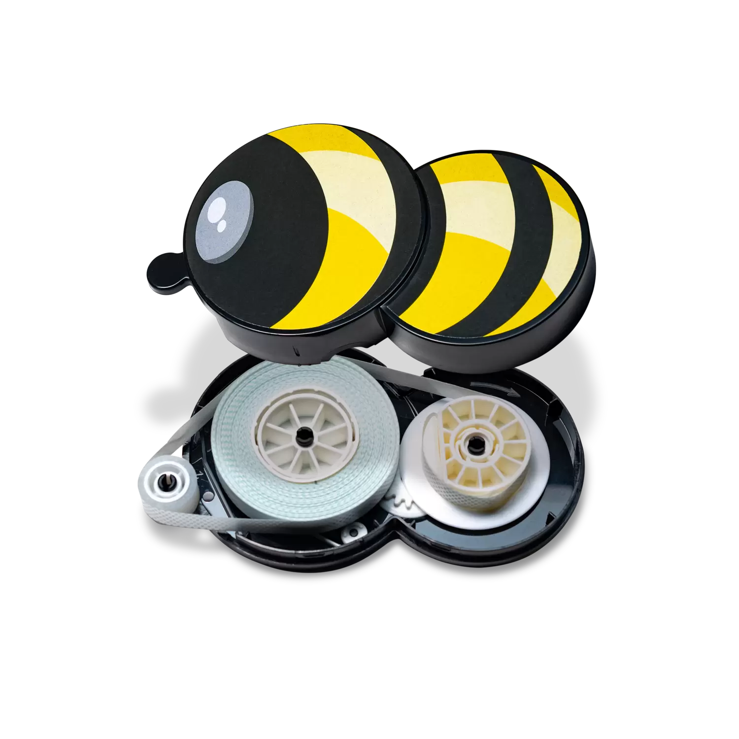 1. Open de Plakbij. 2. Verwijder het oude rolletje en plaats het nieuwe rolletje. 3. Maak het begin van het rolletje los en leg dit van beneden naar boven over de dispenser naar achteren tot aan de sluitpen. 4. Wikkel het uiteinde goed om de sluitpen.