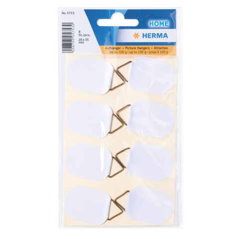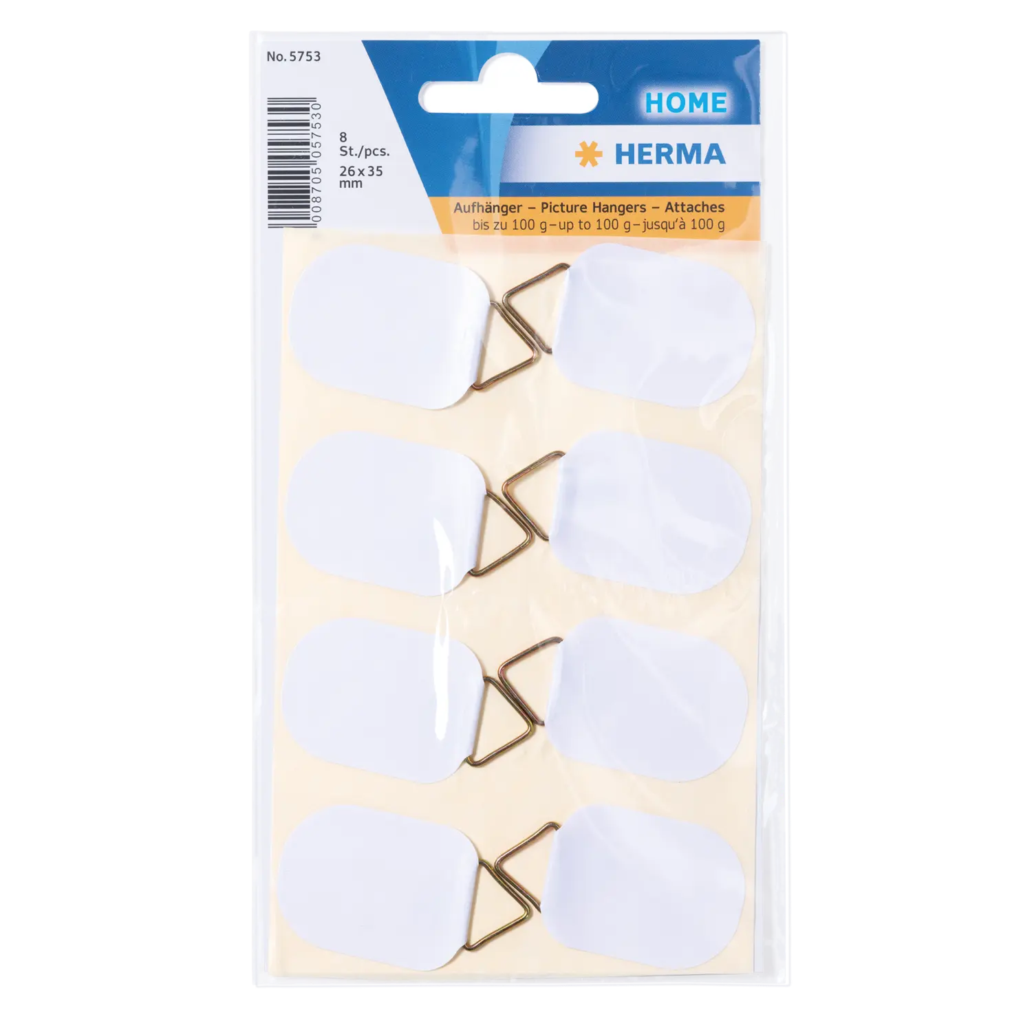 Zelfklevende witte papieren plakhangers van HERMA met ingewerkt metalen haakje voor het ophangen van ansichtkaarten, foto's, affiches en posters en nog veel meer. 8 stuks per verpakking. De permanent hechtende plakhangers meten 26 x 35 mm en kunnen tot 100 gram dragen. Eenvoudig het rugpapier verwijderen, op het voorwerp plakken en ophangen. Een eenvoudige en goedkope manier om kleine decoratieve voorwerpen op te hangen of te verplaatsen en uw huis of kantoor op te fleuren. Hecht op gladde oppervlakken zoals hout, karton, kunststof, glas, porselein, keramiek en meer. Attentie: verminderd draagvermogen op gebogen oppervlakken. Hecht niet op hard- of zachtschuimplaten of gelamineerde oppervlakken.