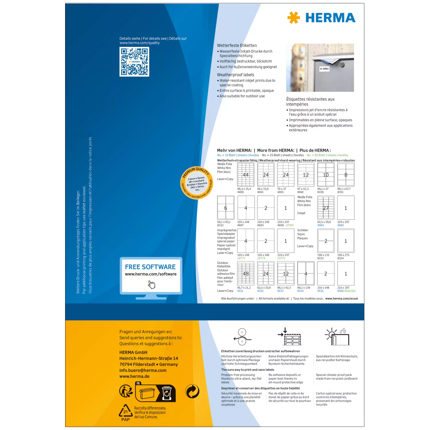 Weervaste inkjet folie-etiketten op A4-vellen, wit/mat, zelfklevend. Uitstekende inkjet-prints in zwart/wit en kleur. Voor zakelijk en privé-gebruik, bijv. voor het prijzen van artikelen in de buitenlucht, voor informatie op de etalage of voor attentie- en waarschuwingplaatjes. Gegarandeerd watervaste afdrukken in zwart/wit en kleur, lichtechte inkt gebruiken. Speciale coating zorgt voor fixeren van de inkt direct na het afdrukken. Met rand rondom: over het volledige oppervlak te bedrukken en ideaal ook voor inkjetprinters met kritisch papiertransport. Gratis softwareoplossingen: www.herma.com/software.