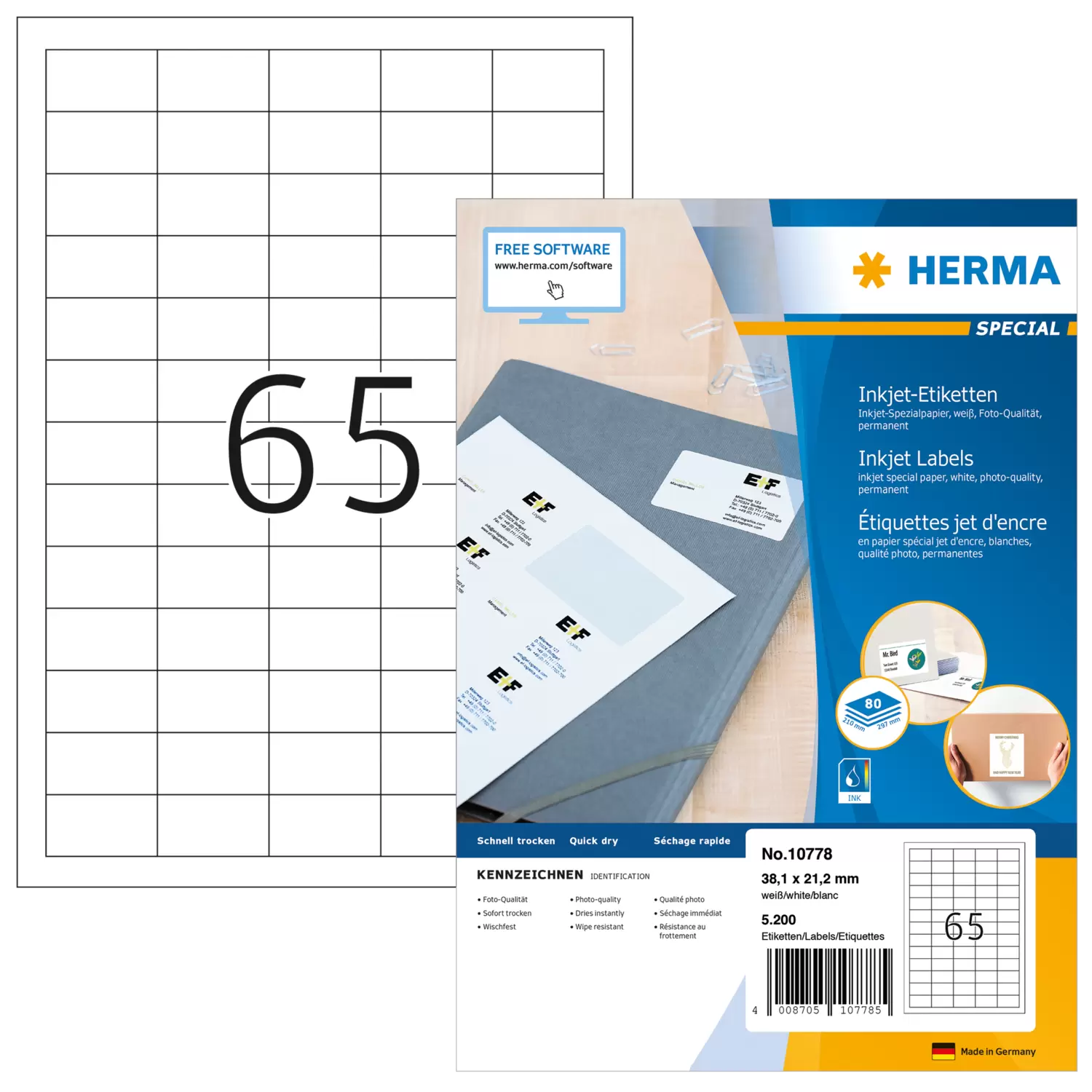 Etiketten, speciaal voor inkjetprinters, op A4-vellen, zelfklevend. Van hoogwaardig gestreken speciaal papier, 90 g/m² voor scherpe contouren en afdrukken in schitterende kleuren van foto-kwaliteit. Storingvrije verwerking dankzij veiligheidsrand rondom en optimale vlakligging. Alle uitvoeringen met rand rondom: over het volledige oppervlak te bedrukken en ideaal ook voor inkjetprinters met kritisch papiertransport. Gratis softwareoplossingen: www.herma.com/software.