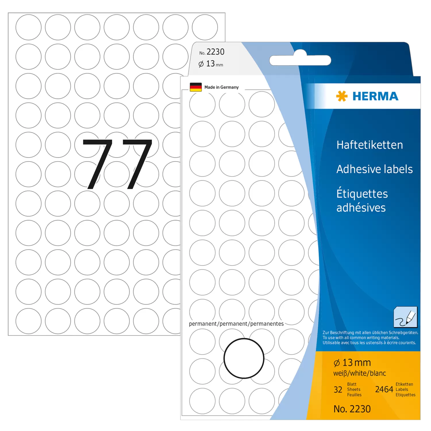 Multipurpose-etiketten, Ø 13 mm, rond wit, permanent hechtend, om met de hand te beschrijven
