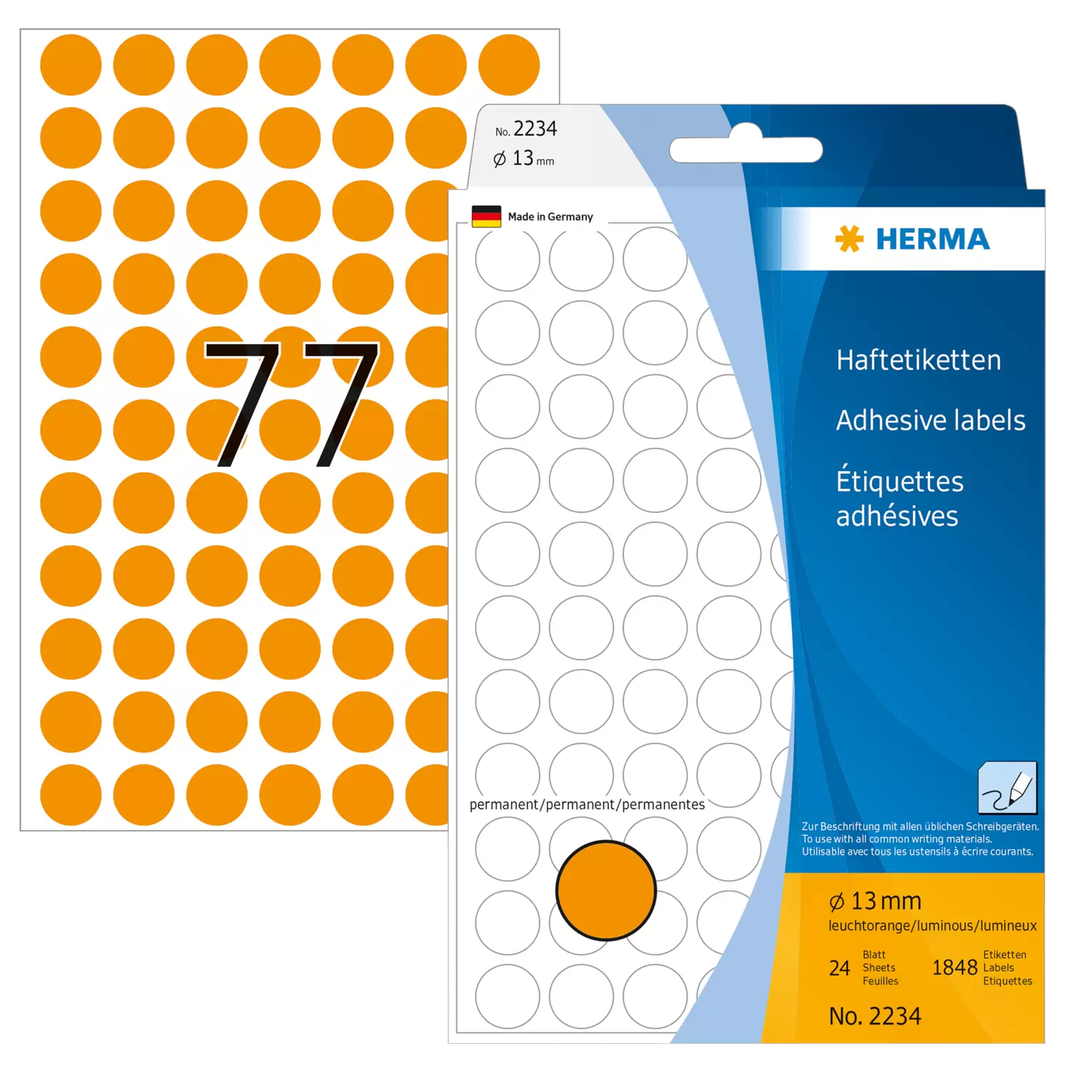 Multipurpose-etiketten, Ø 13 mm, rond fluor oranje, permanent hechtend, om met de hand te beschrijve