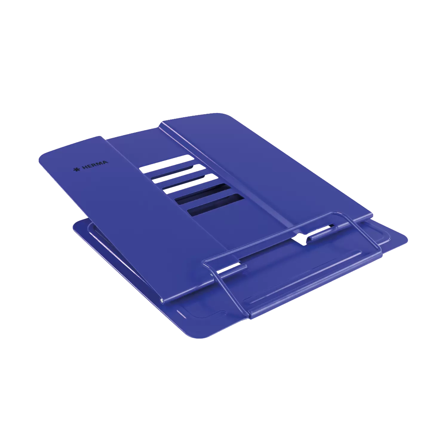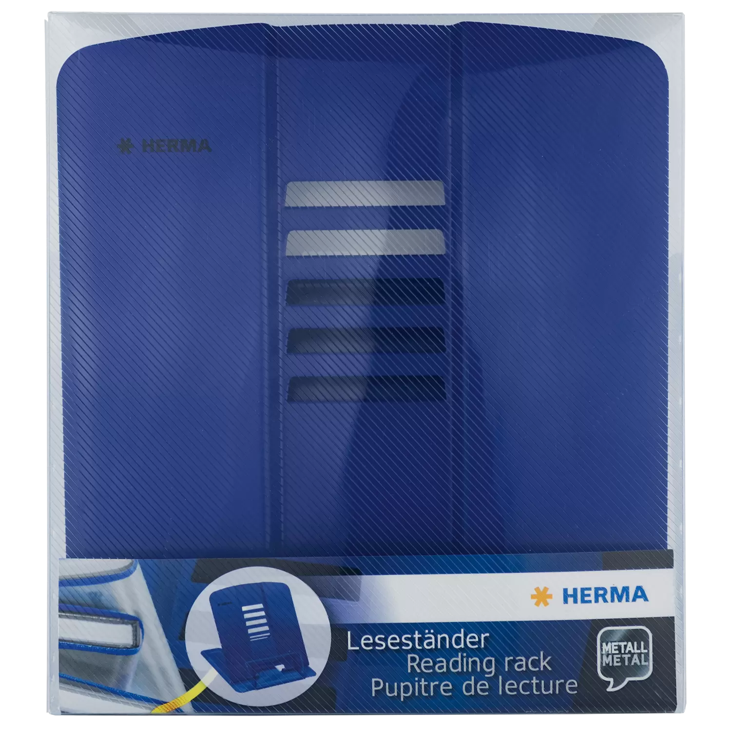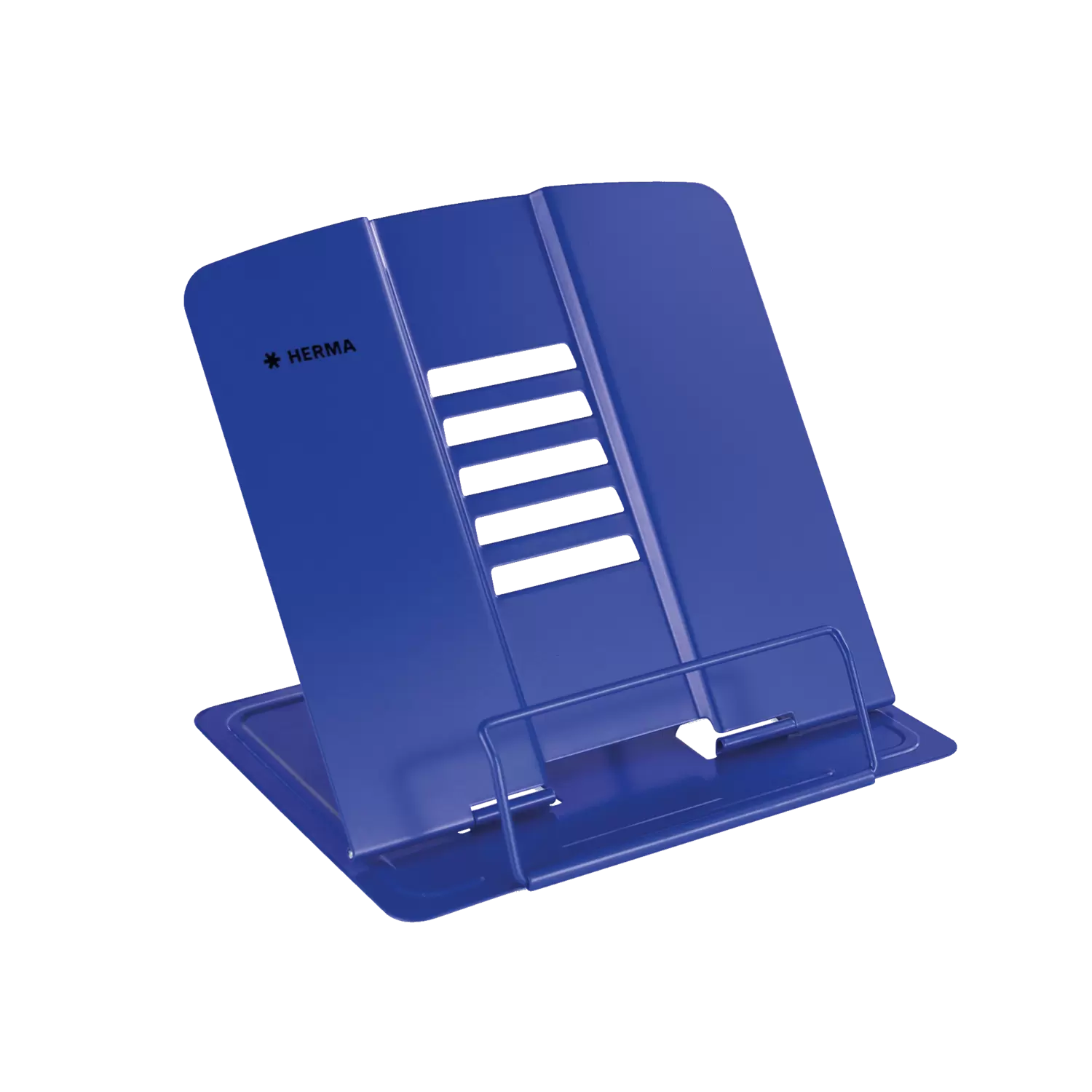Leesstandaard, boekensteun, boeken- en kookboekhouder, tablet-steun: er zijn veel benamingen voor de unieke en multifunctionele boekenstandaard van HERMA. De leesstandaard is blauw, van gelakt metaal en uitgeklapt 19 cm hoog, 19,8 cm breed en 15,7 cm diep. Daarom is hij ook geschikt voor zware boeken, atlassen en tablets. Hij kan in 5 standen schuin worden gesteld, zodat het op het bureau, op de campus of in de keuken ook voor de nek altijd prettig lezen is. De antislipnoppen aan de onderkant zorgen ervoor dat hij stevig en optimaal staat. Als hij even niet nodig is of meegenomen moet worden, kan hij heel eenvoudig worden ingeklapt en opgeborgen. De multifunctionele boekenstandaard is bovendien verkrijgbaar in de kleuren wit en roze. Perfect om bijvoorbeeld boeken, tablets, tijdschriften, schriften, muziekbladen en kookboeken, van verschillende formaten, die perfecte stand en steun te bieden. Flexibel inzetbaar in kantoor of HomeOffice, op reis, op school, op de campus, in kleuterschool of crèche, in de keuken of bij het outdoor barbecueën en thuis op de bank.