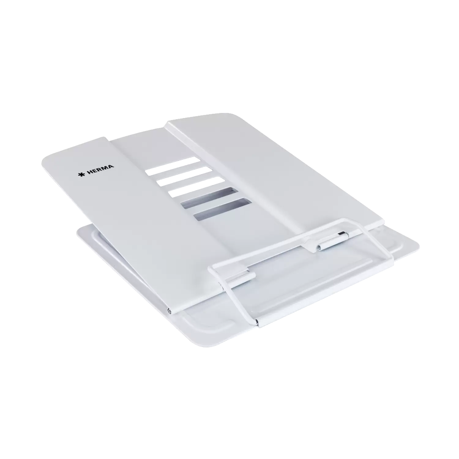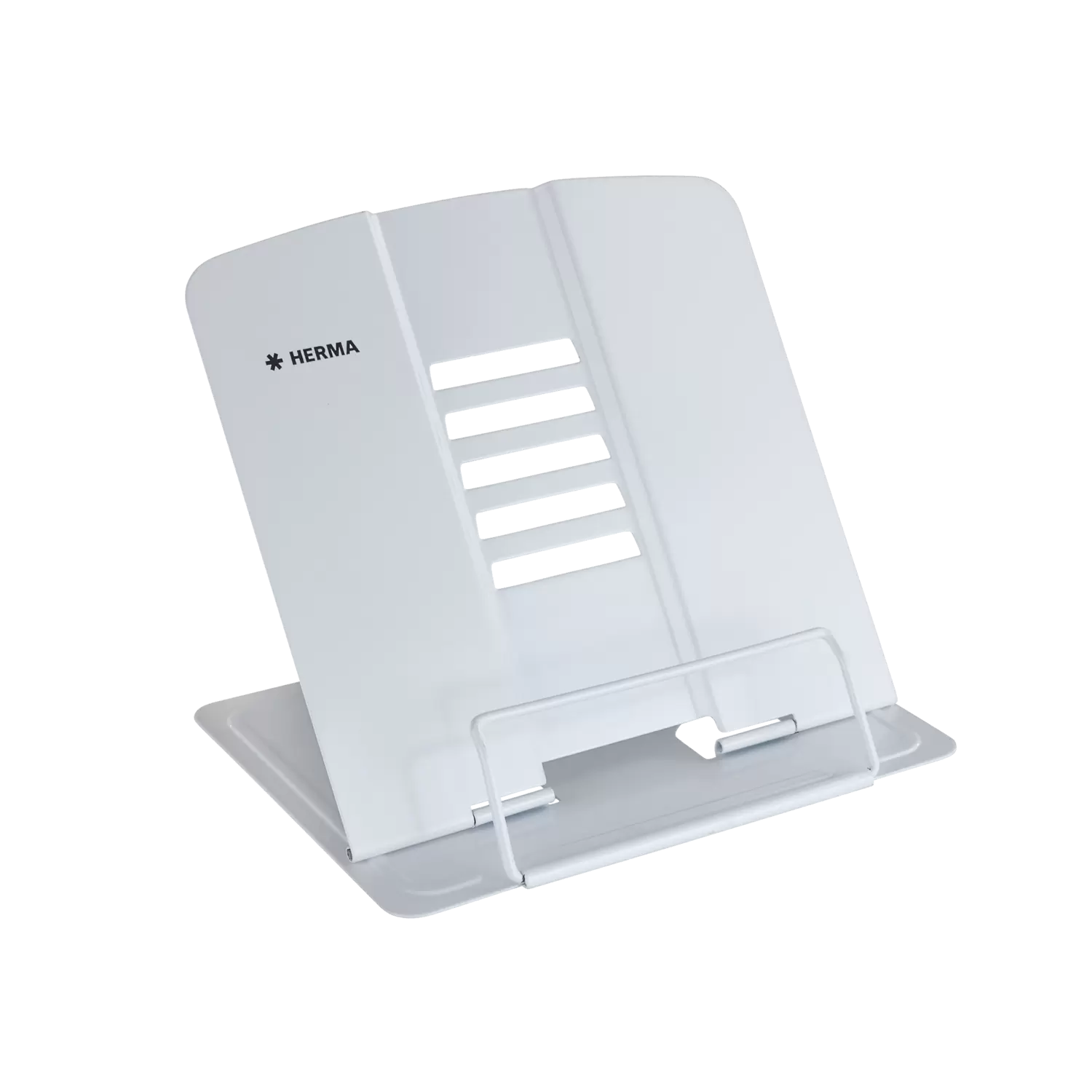 Leesstandaard, boekensteun, boeken- en kookboekhouder, tablet-steun: er zijn veel benamingen voor de unieke en multifunctionele boekenstandaard van HERMA. De leesstandaard is wit, van gelakt metaal en uitgeklapt 19 cm hoog, 19,8 cm breed en 15,7 cm diep. Daarom is hij ook geschikt voor zware boeken, atlassen en tablets. Hij kan in 5 standen schuin worden gesteld, zodat het op het bureau, op de campus of in de keuken ook voor de nek altijd prettig lezen is. De antislipnoppen aan de onderkant zorgen ervoor dat hij stevig en optimaal staat. Als hij even niet nodig is of meegenomen moet worden, kan hij heel eenvoudig worden ingeklapt en opgeborgen. De multifunctionele boekenstandaard is bovendien verkrijgbaar in de kleuren blauw en roze. Perfect om bijvoorbeeld boeken, tablets, tijdschriften, schriften, muziekbladen en kookboeken, van verschillende formaten, die perfecte stand en steun te bieden. Flexibel inzetbaar in kantoor of HomeOffice, op reis, op school, op de campus, in kleuterschool of crèche, in de keuken of bij het outdoor barbecueën en thuis op de bank.