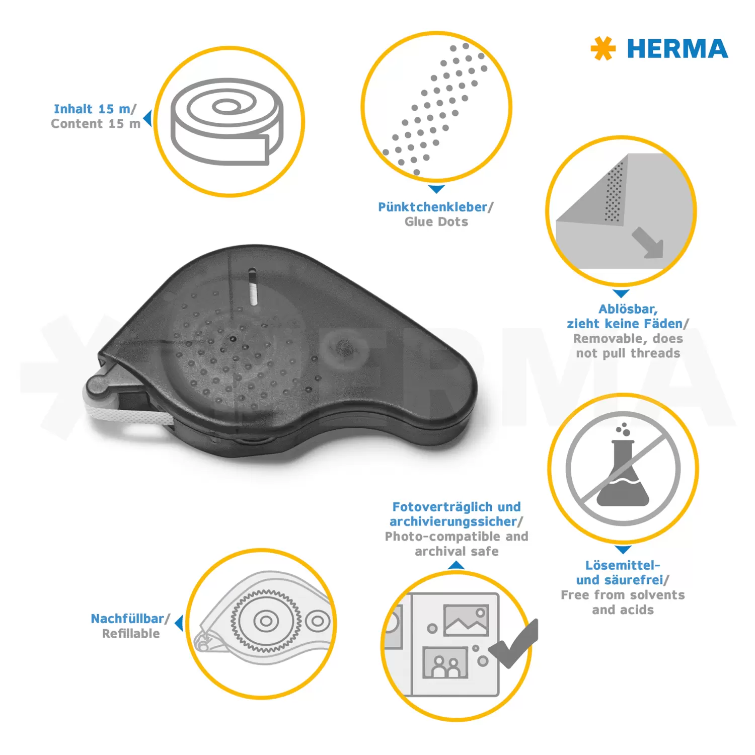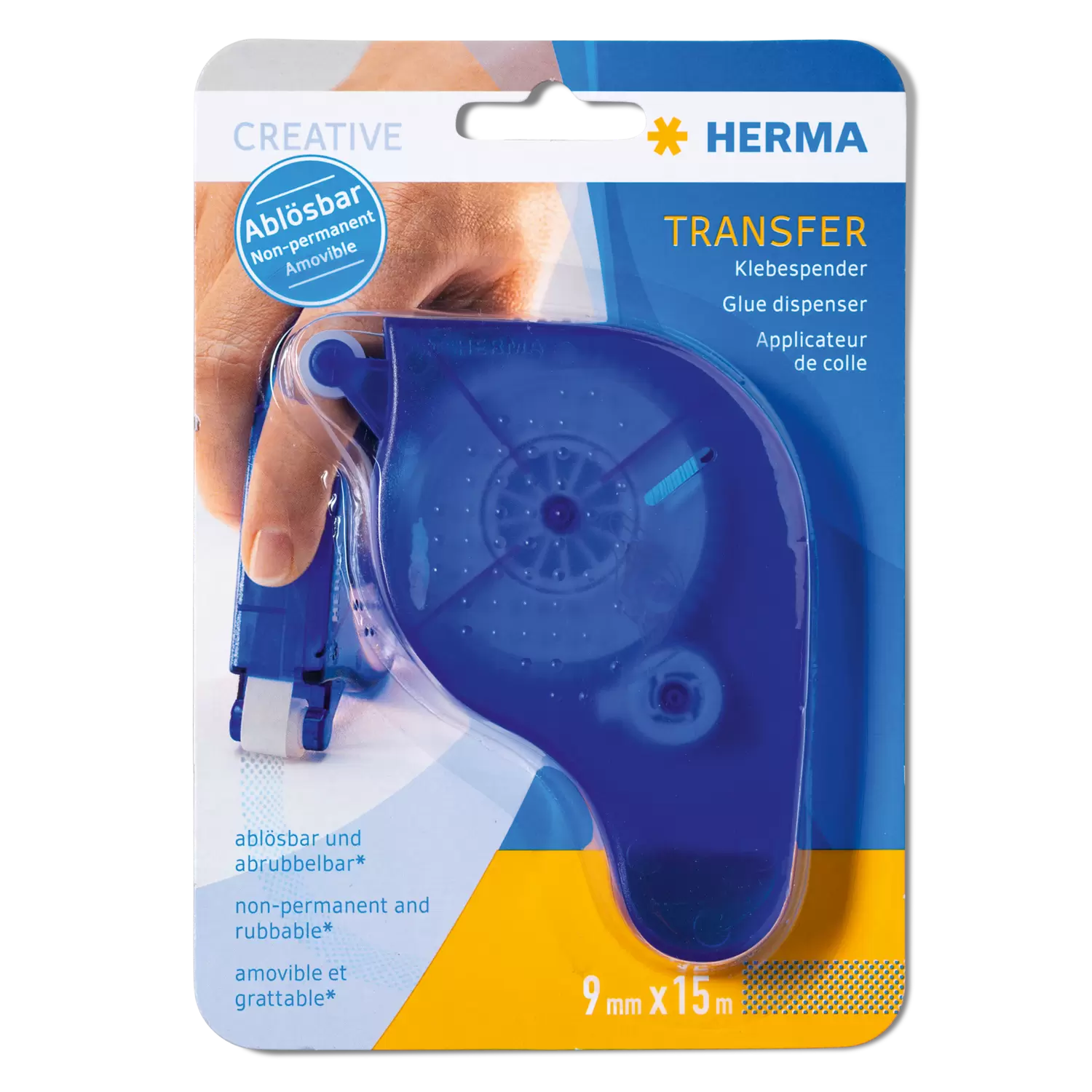 De HERMA lijmrollers Transfer, verwijderbaar zijn de snelle en eenvoudige oplossing voor elke lijmklus. Ze garanderen snel, netjes en nauwkeurig lijmen op papier, karton en veel andere materialen en zijn daarmee optimaal geschikt voor kantoor, school, om te knutselen, voor het inplakken van foto's of om creatief bezig te zijn met hout, kurk, folie en andere materialen. De ergonomisch gevormde lijmrollers zijn met één hand te bedienen en dankzij de praktische navulrol zijn ze steeds gereed voor gebruik. Vastgeplakt? Geen probleem – de tape hardt niet uit en maakt zo herpositioneren mogelijk. De gripvlakken aan de zijkanten zorgen voor optimale grip, zo liggen ze goed in de hand en zijn supergemakkelijk te gebruiken – ook voor linkshandigen. De transparante 9 mm brede tape is oplosmiddel- en zuurvrij, daarnaast fotoproof en archiveringsbestendig. Door het afrollen worden kleine plakkers aangebracht, waarmee alles stevig wordt bevestigd.