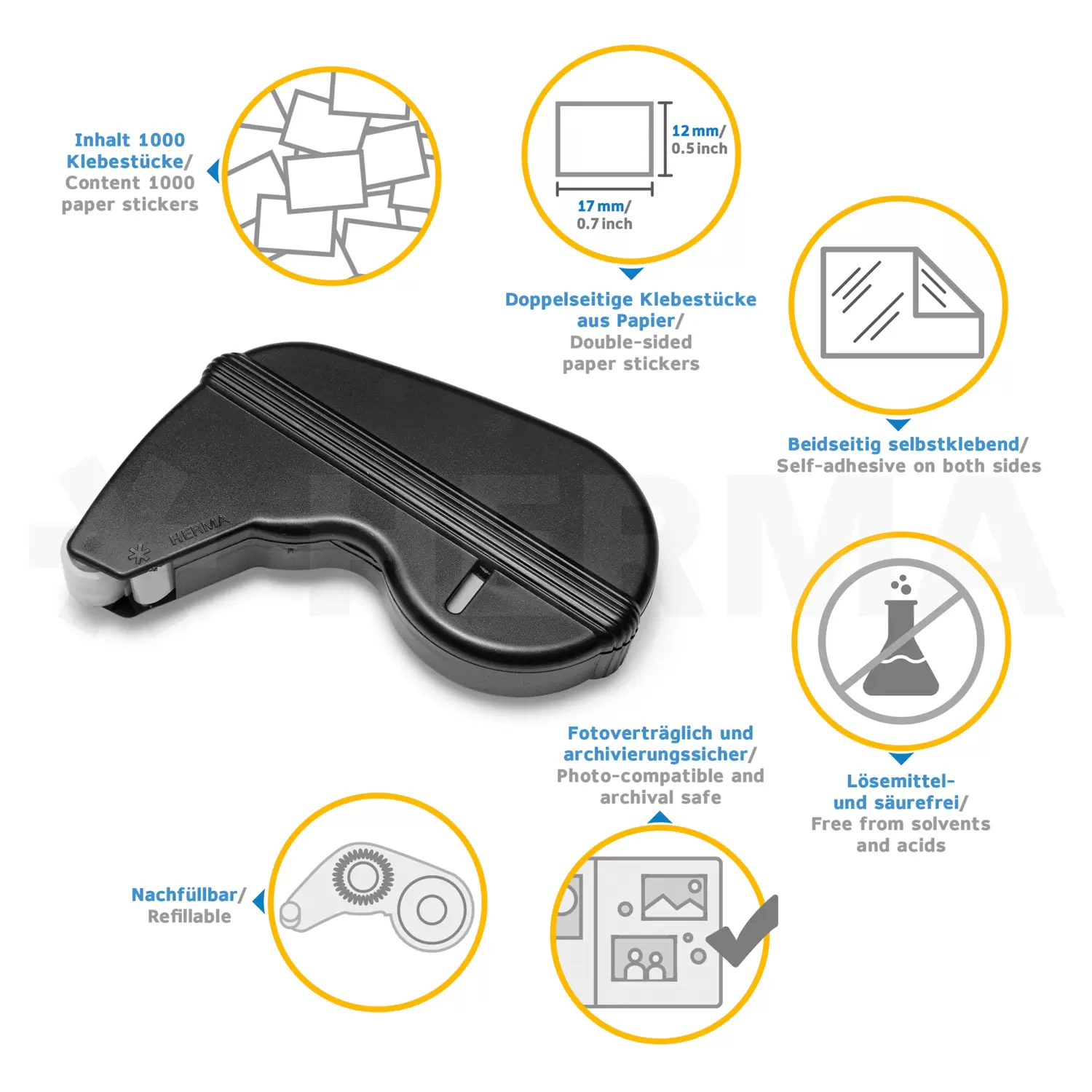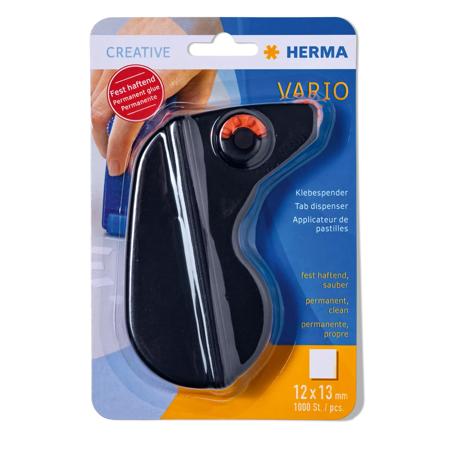 De HERMA lijmrollers Vario, sterk hechtend zijn de snelle en eenvoudige oplossing voor elke lijmklus. 1000 lijmpads van het formaat 12 x 13 mm garanderen snel, netjes en nauwkeurig lijmen op papier, karton en veel andere materialen en zijn daarmee optimaal geschikt voor kantoor, school, om te knutselen, voor het inplakken van foto's of om creatief bezig te zijn met hout, kurk, folie en andere materialen. De ergonomisch gevormde lijmrollers zijn met één hand te bedienen en zijn dankzij de praktische navulrol steeds gereed voor gebruik. De lijmpads zijn oplosmiddel- en zuurvrij, daarnaast fotoproof en archiveringsbestendig. Ze kunnen stuk voor stuk of achter elkaar afrollen, waarmee alles stevig wordt bevestigd.